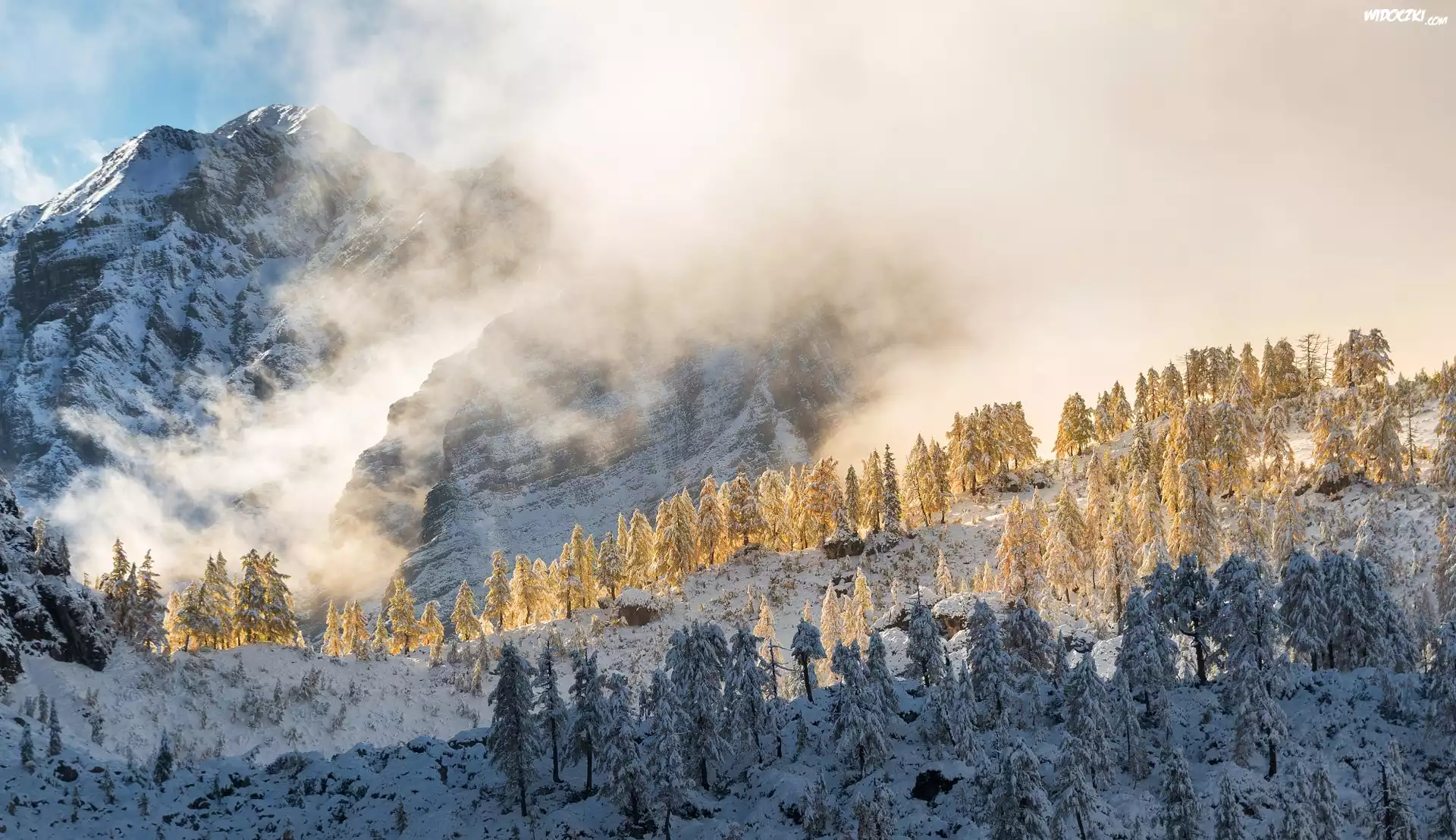 Słowenia, Triglavski Park Narodowy, Zima, Śnieg, Góry, Mgła, Drzewa