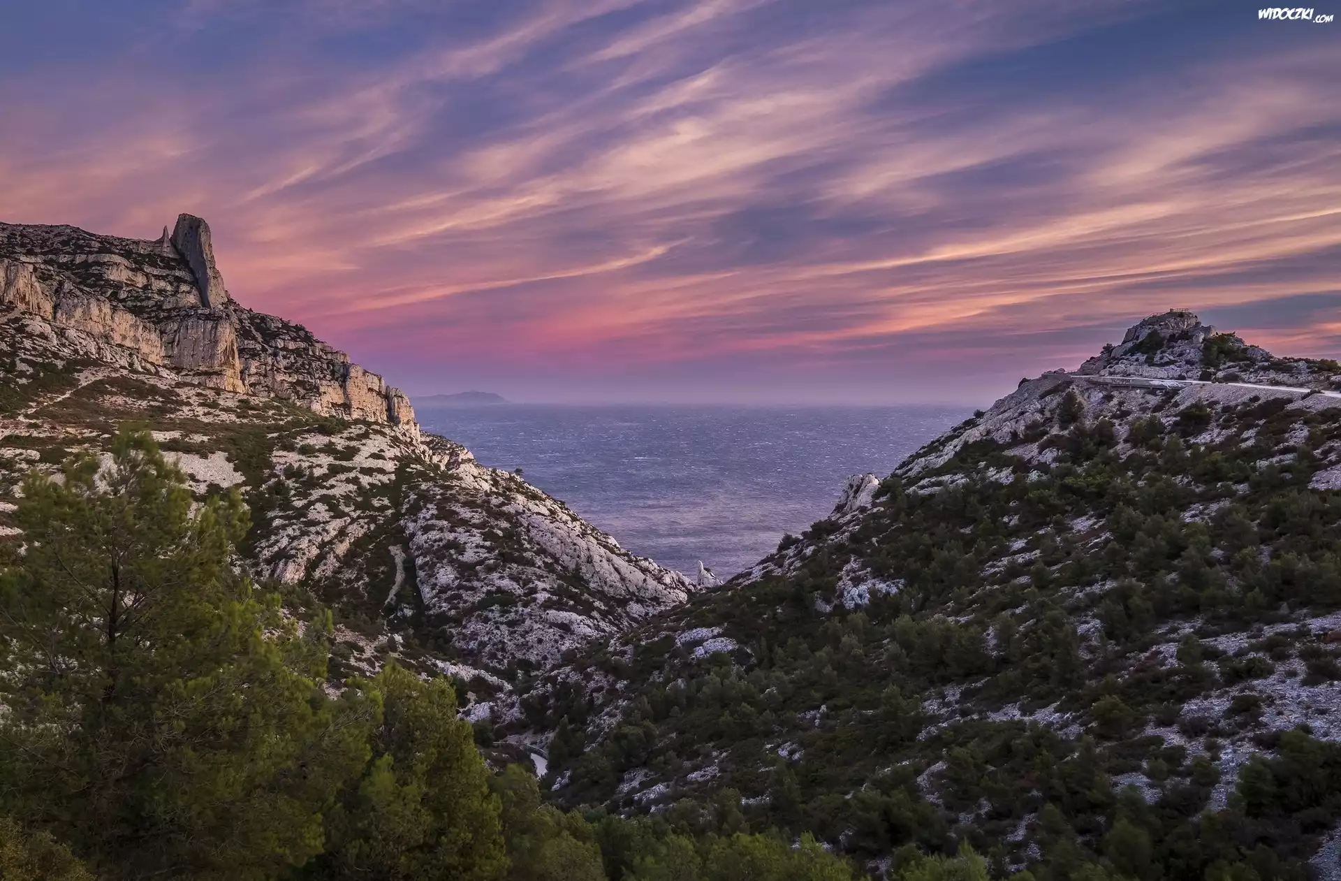 Zdjęcia, Góry, Skały wapienne, Morze, Park Narodowy Calanques, Marsylia, Francja, Drzewa