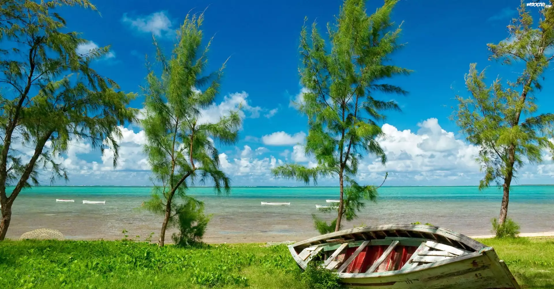 Zdjęcia, Łódka, Plaża, Drzewa, Morze