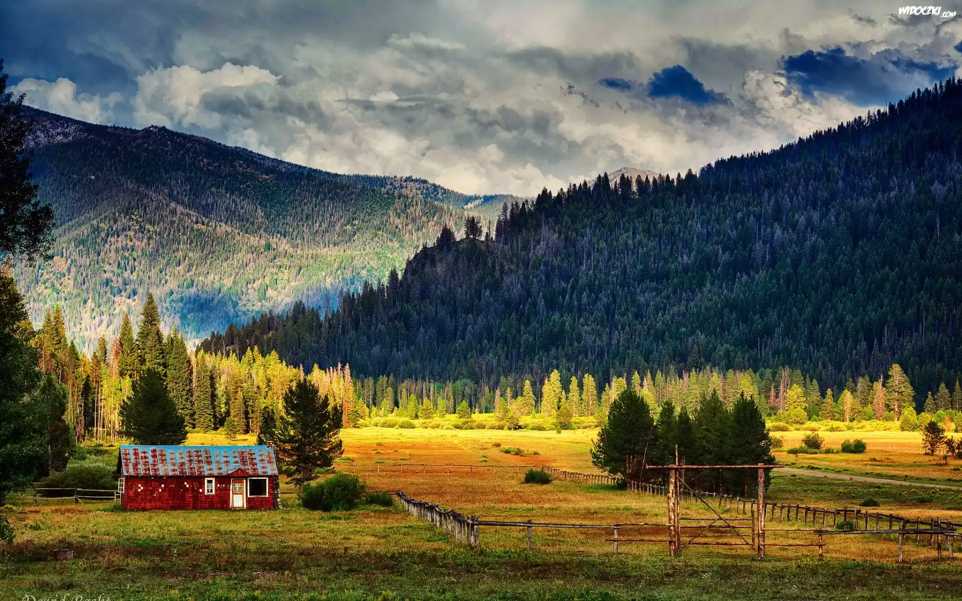 Góry, Drzewa, Pole, Czerwony, Dom, Chmury, Drewniany, Płot