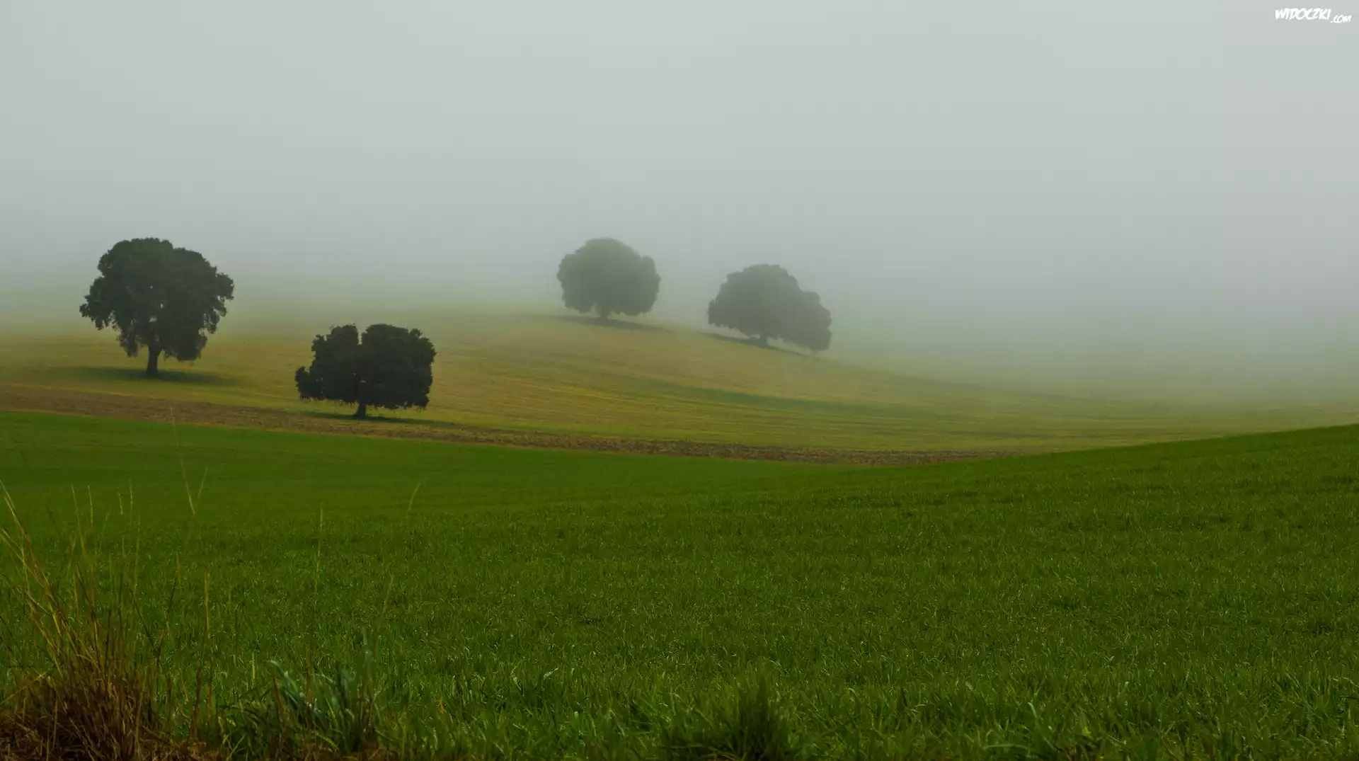 Zdjęcia, Pola, Drzewa, Mgła