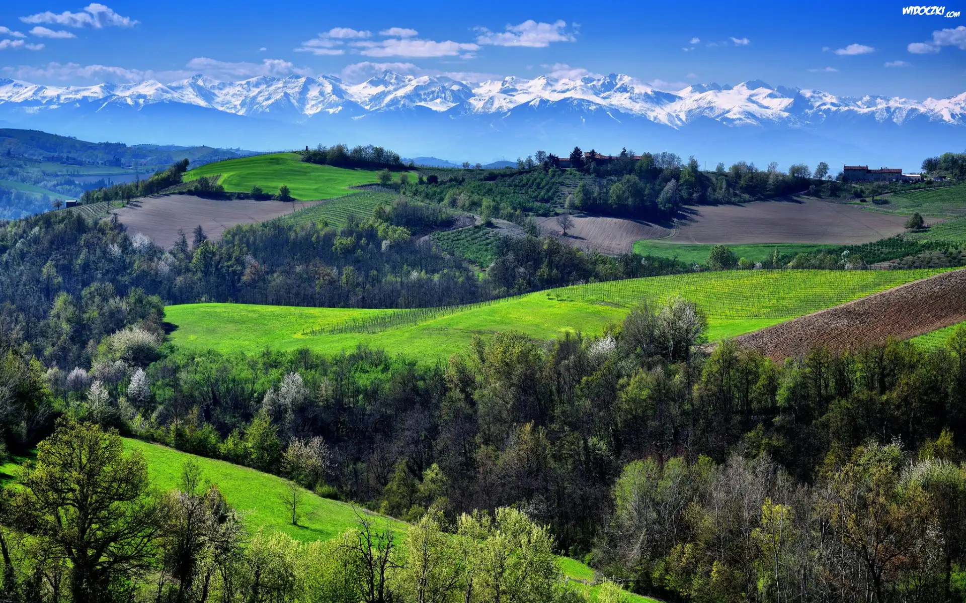 Góry, Wzgórza, Winnice, Drzewa, Wiosna, Pola