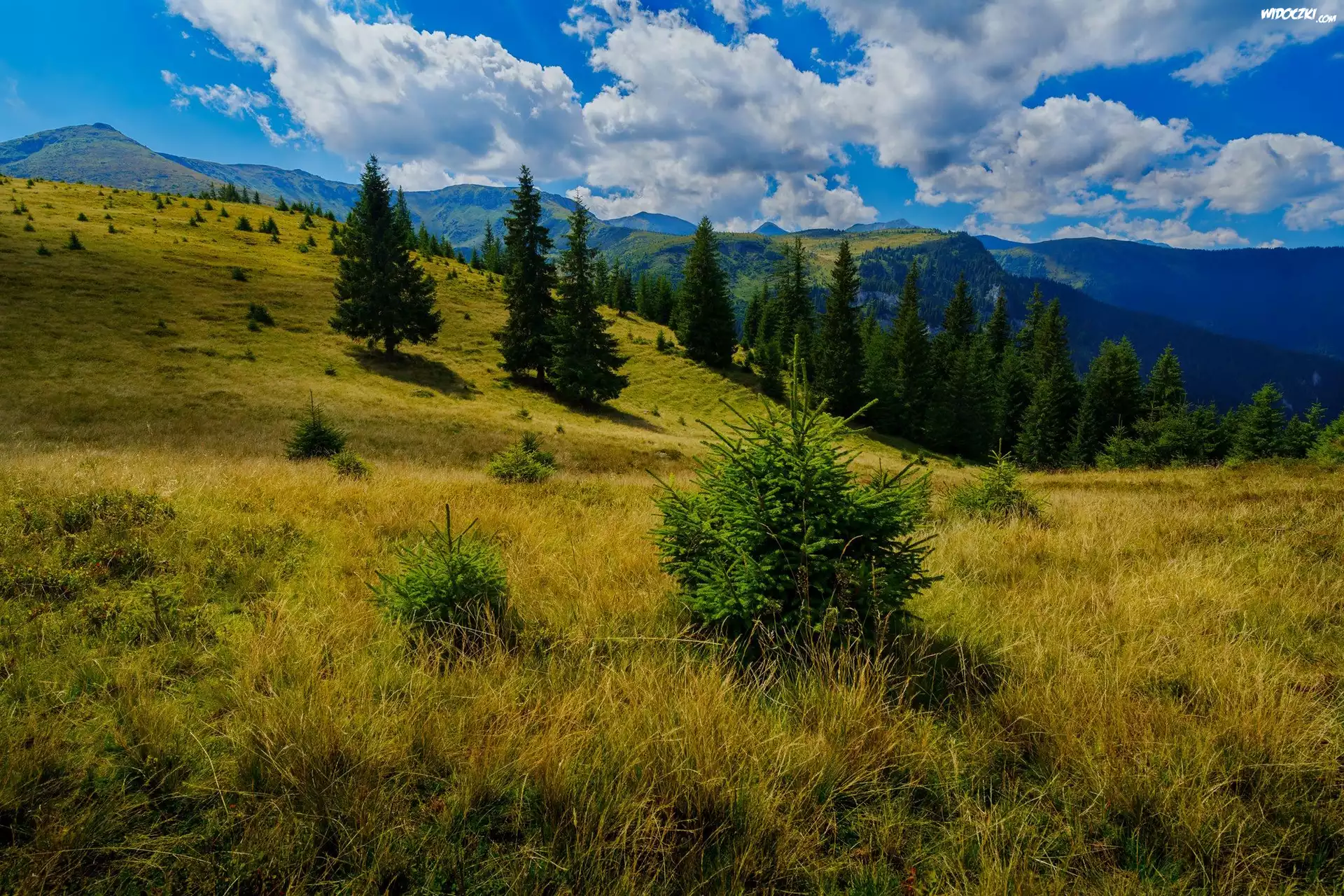 Góry, Drzewa, Polana, Trawa, Chmury