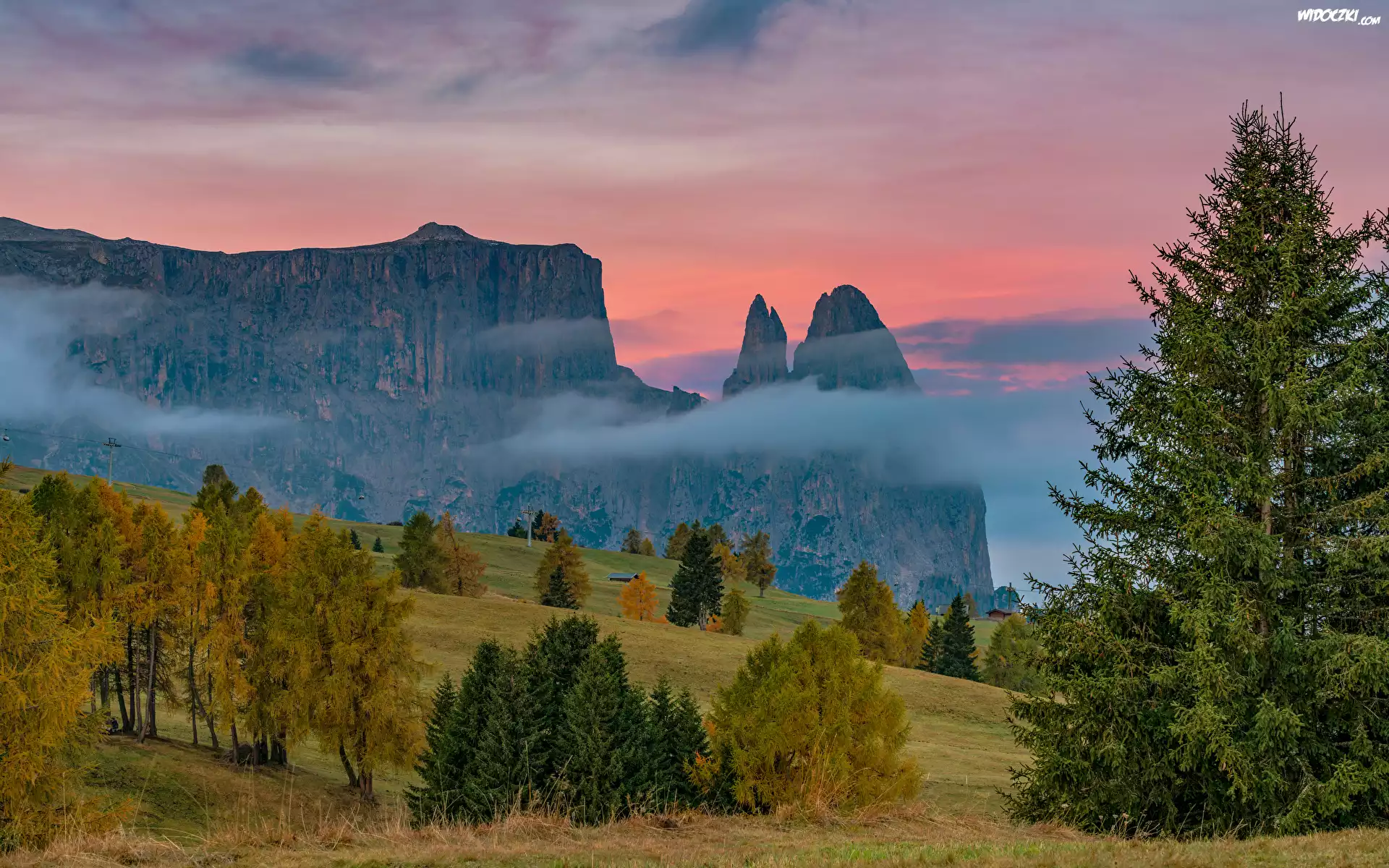 Zdjęcia, Góry, Dolomity, Góra Schlern, Skały, Las, Drzewa, Polana, Mgła, Tyrol, Włochy