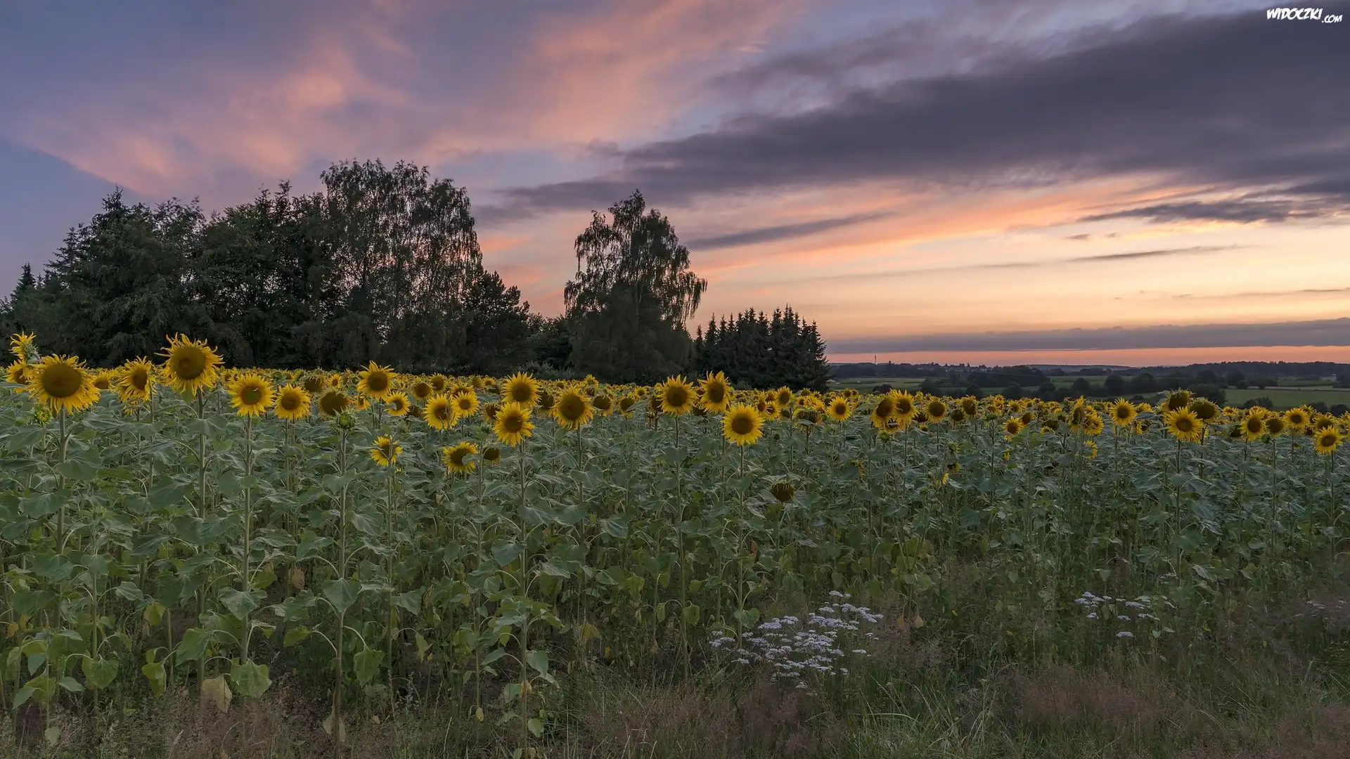 Słoneczniki, Drzewa, Pole, Zachód słońca