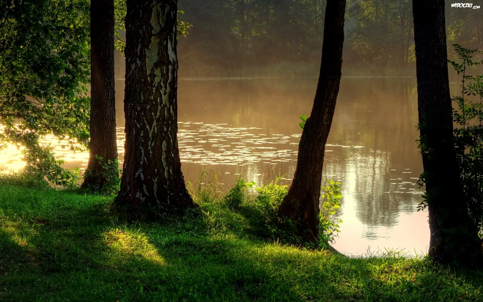 Zdjęcia, Drzewa, Rzeka, Poranek, Mgła