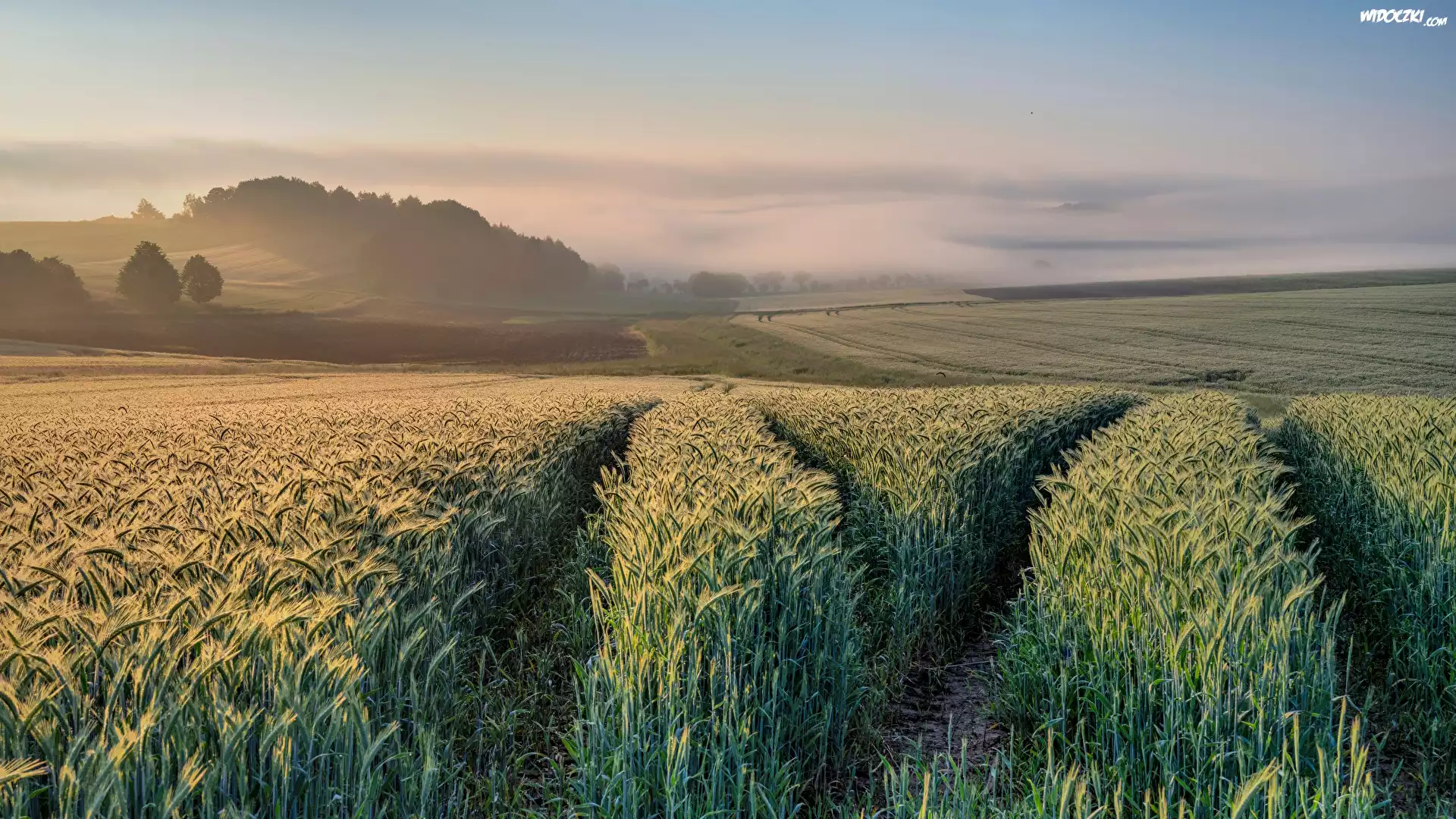 Zdjęcia, Wzgórza, Pola, Zboże, Drzewa, Mgła, Poranek