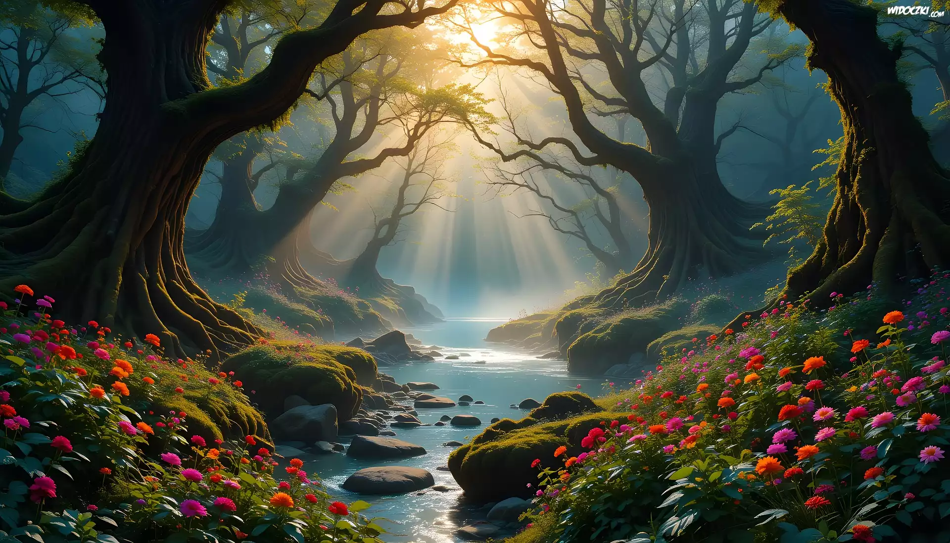 Przyroda, Natura, Krajobraz, Las, Potok, Leśny, Kamienie, Kwiaty, Drzewa, Konary, Promienie, Słońca, Grafika, Komputerowa |