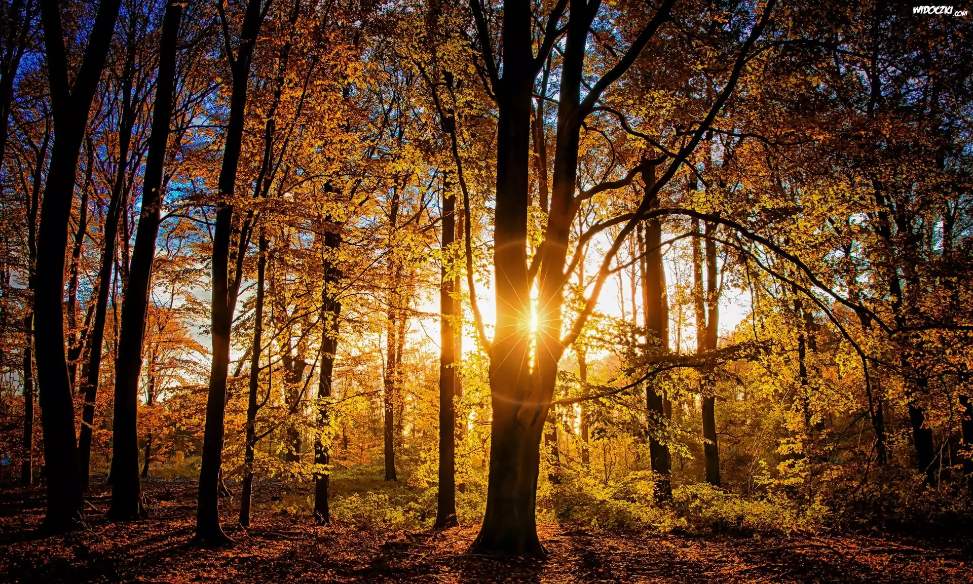 Zdjęcia, Drzewa, Las, Jesień, Promienie słońca