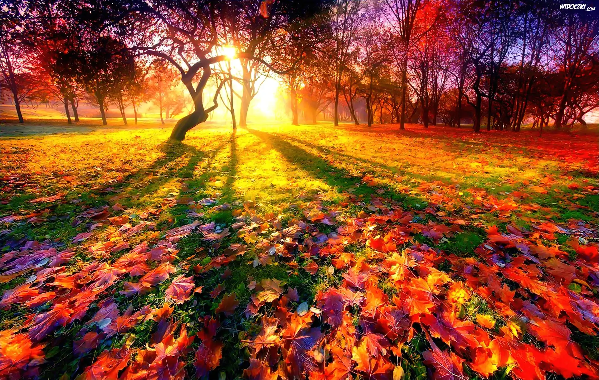 Drzewa, Liście, Jesień, Przebijające, Światło