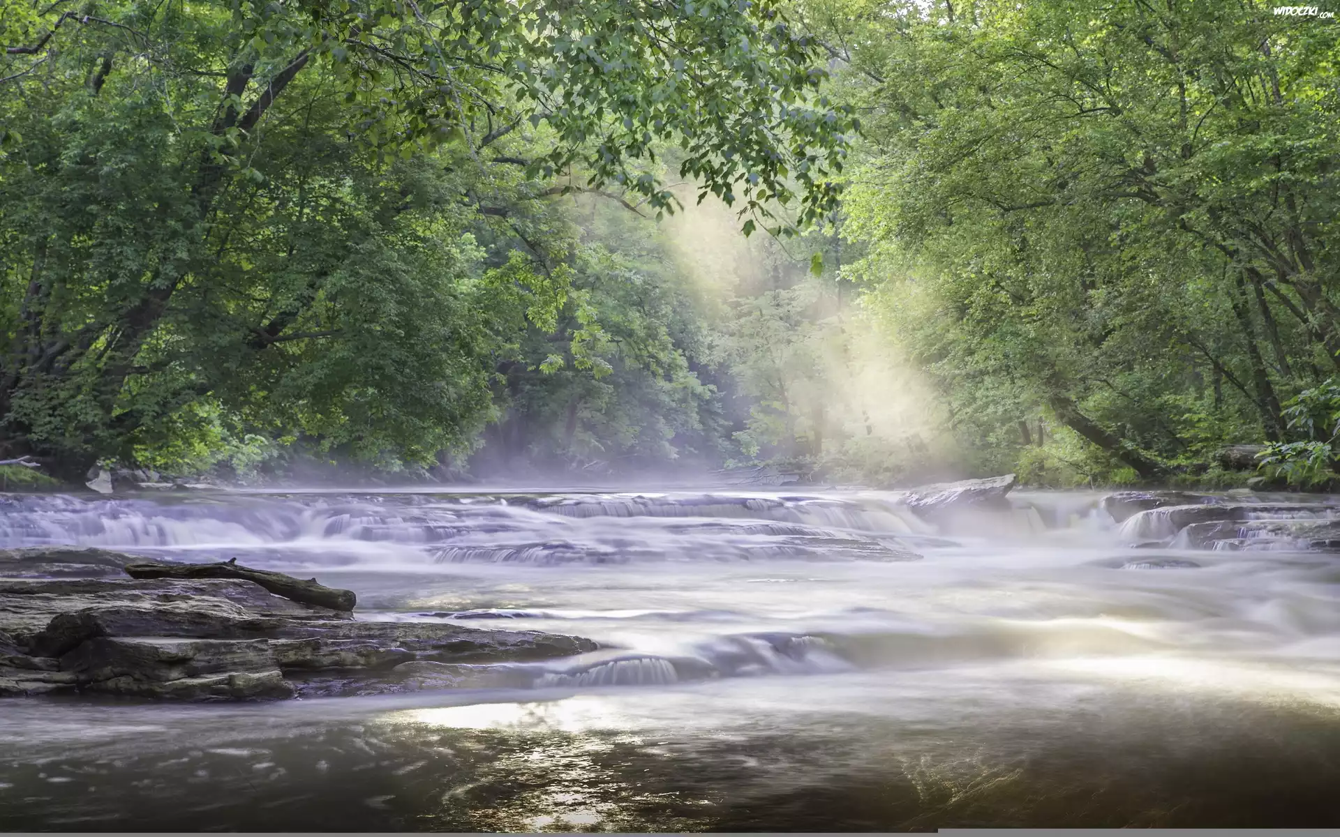 Zdjęcia, Drzewa, Kaskady, Wody, Przebijające, Światło