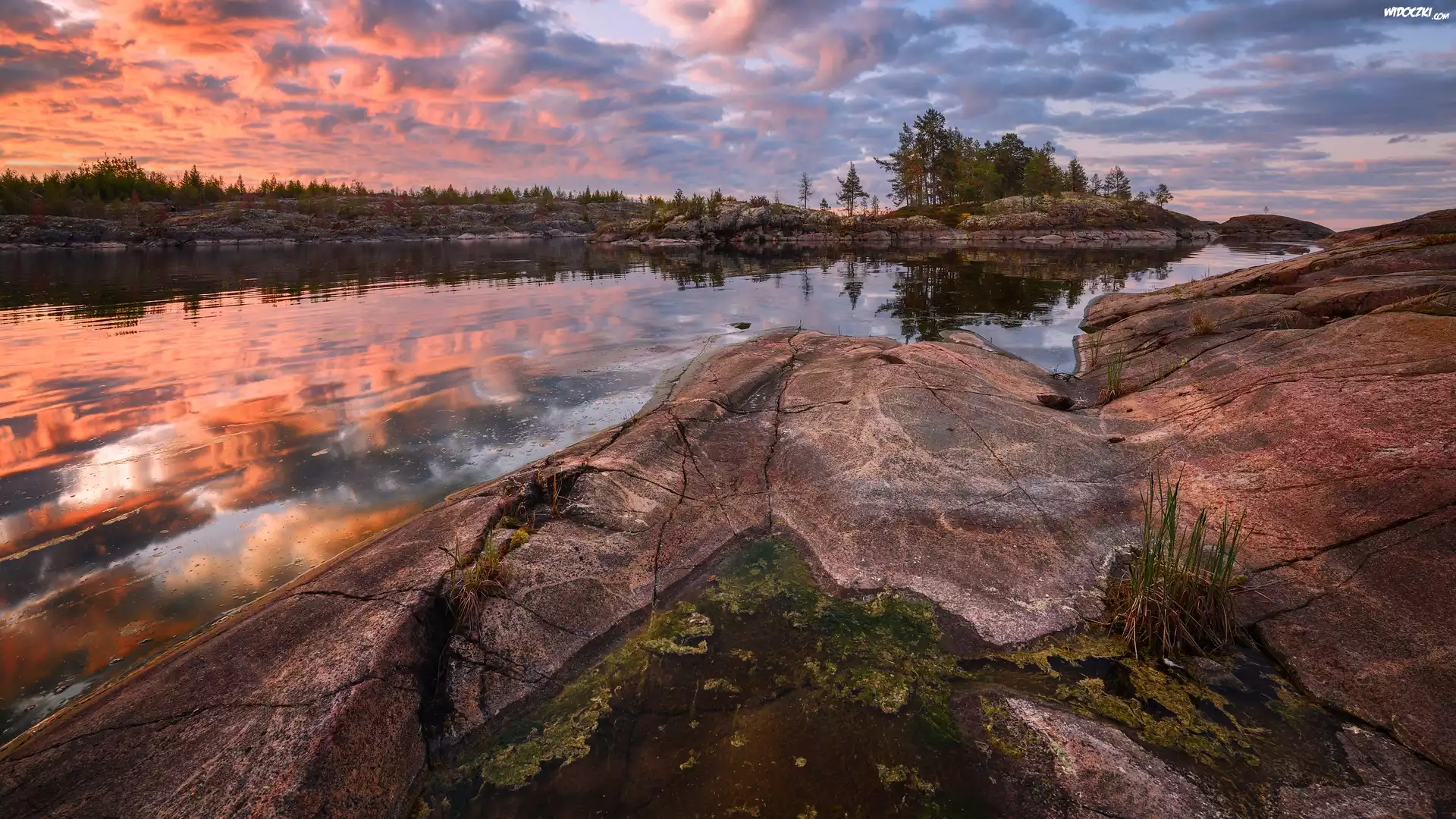 Zdjęcia, Jezioro Ładoga, Skały, Drzewa, Chmury, Rosja