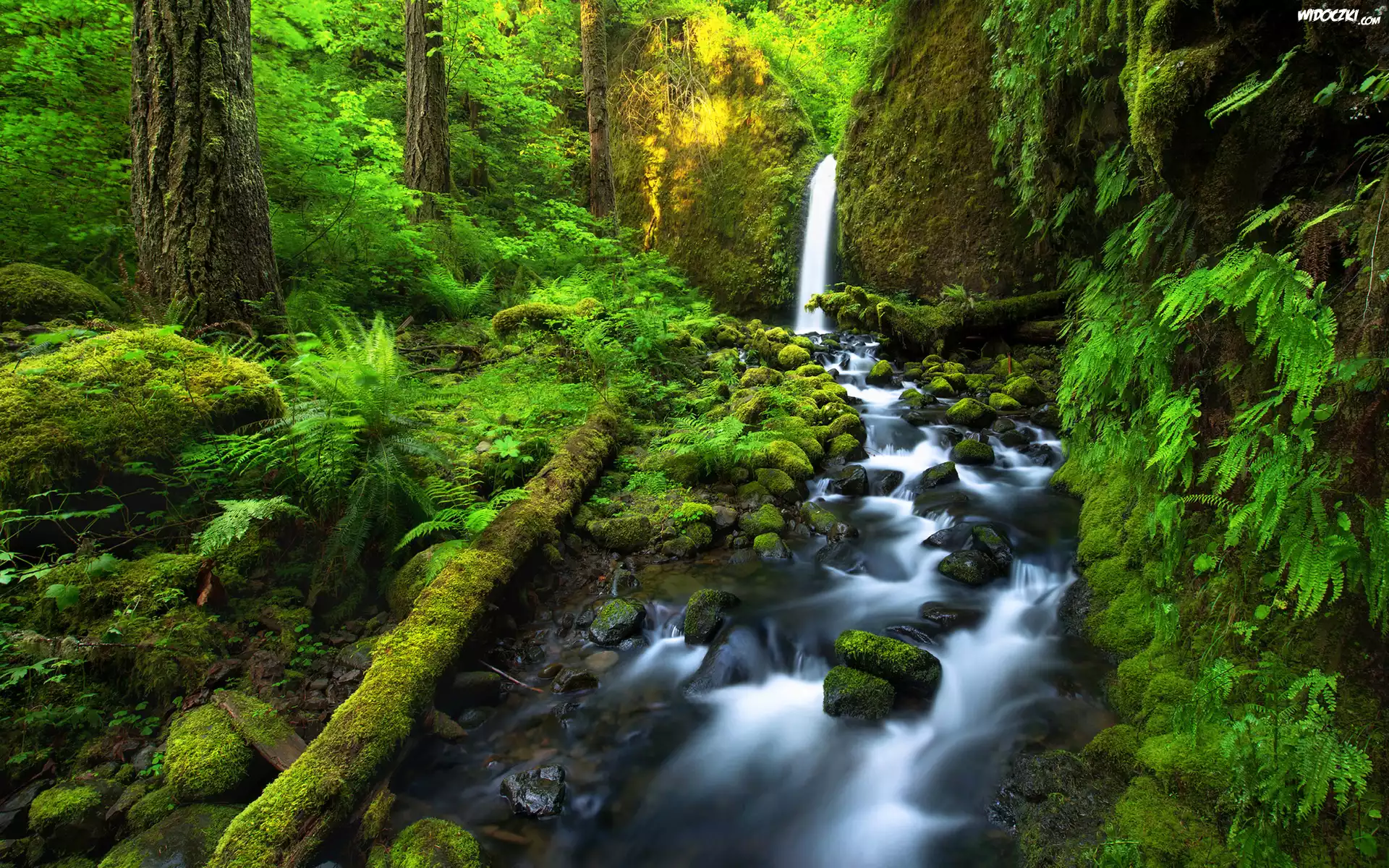 Las, Drzewa, Wodospad, Strumień, Omszałe, Kamienie, Paprocie, Rośliny