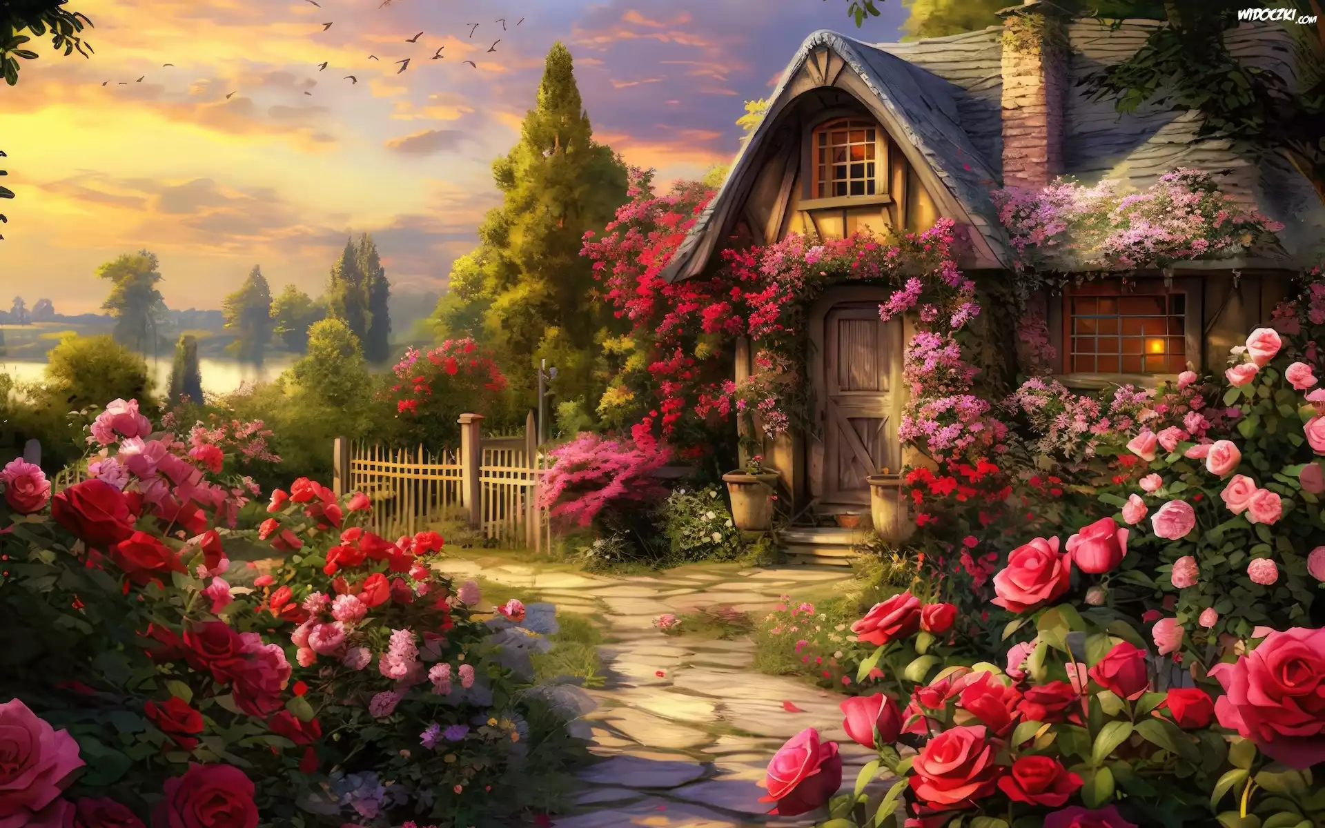 Zdjęcia, Grafika, Dom, Ogród, Drzewa, Kwiaty, Róże