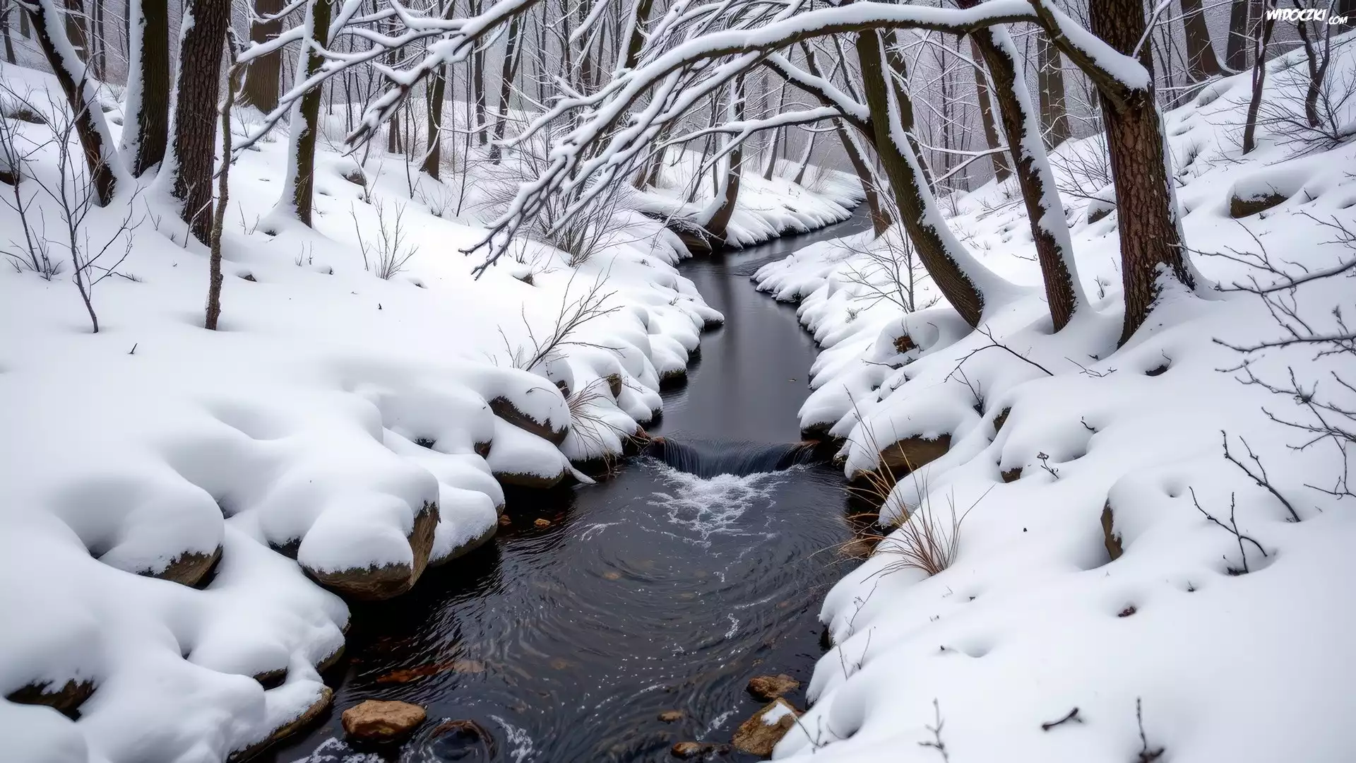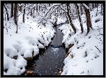 Zdjęcia, Zima, Ośnieżone, Gałęzie, Drzewa, Las, Rzeka