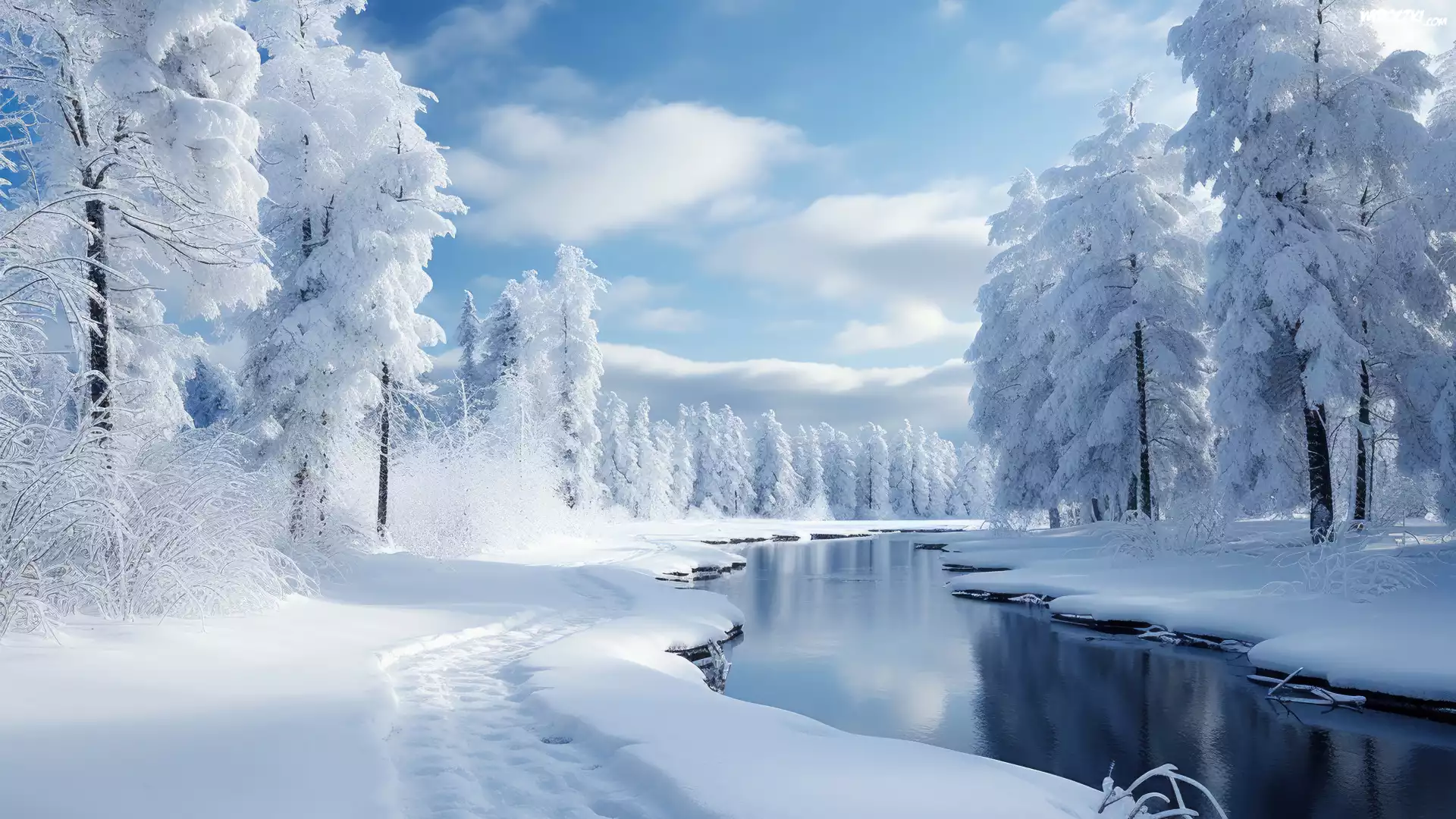Zima, Las, Rzeka, Drzewa, Åšnieg, Niebo, 2D