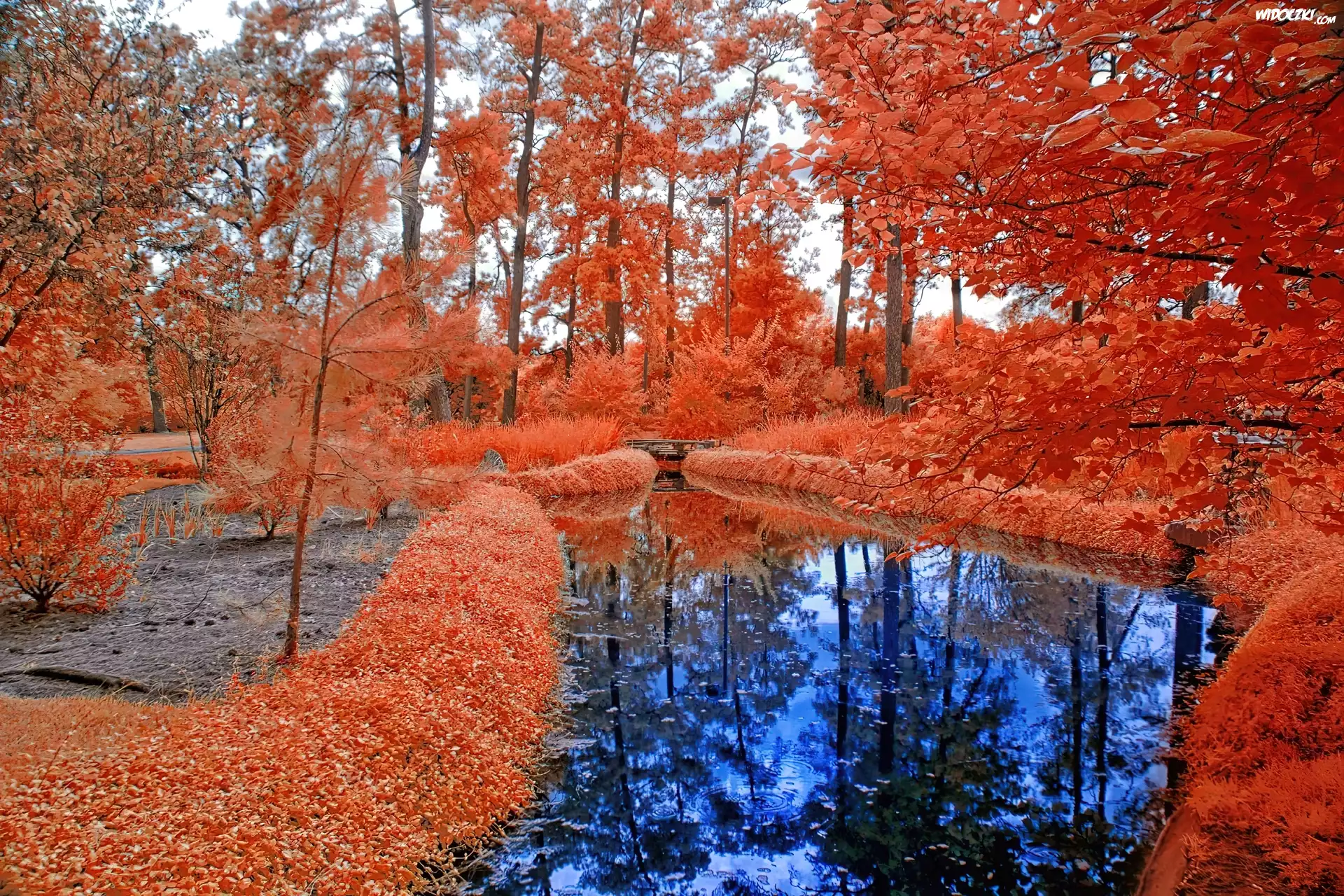 Drzewa, Liście, Rzeka, Jesień