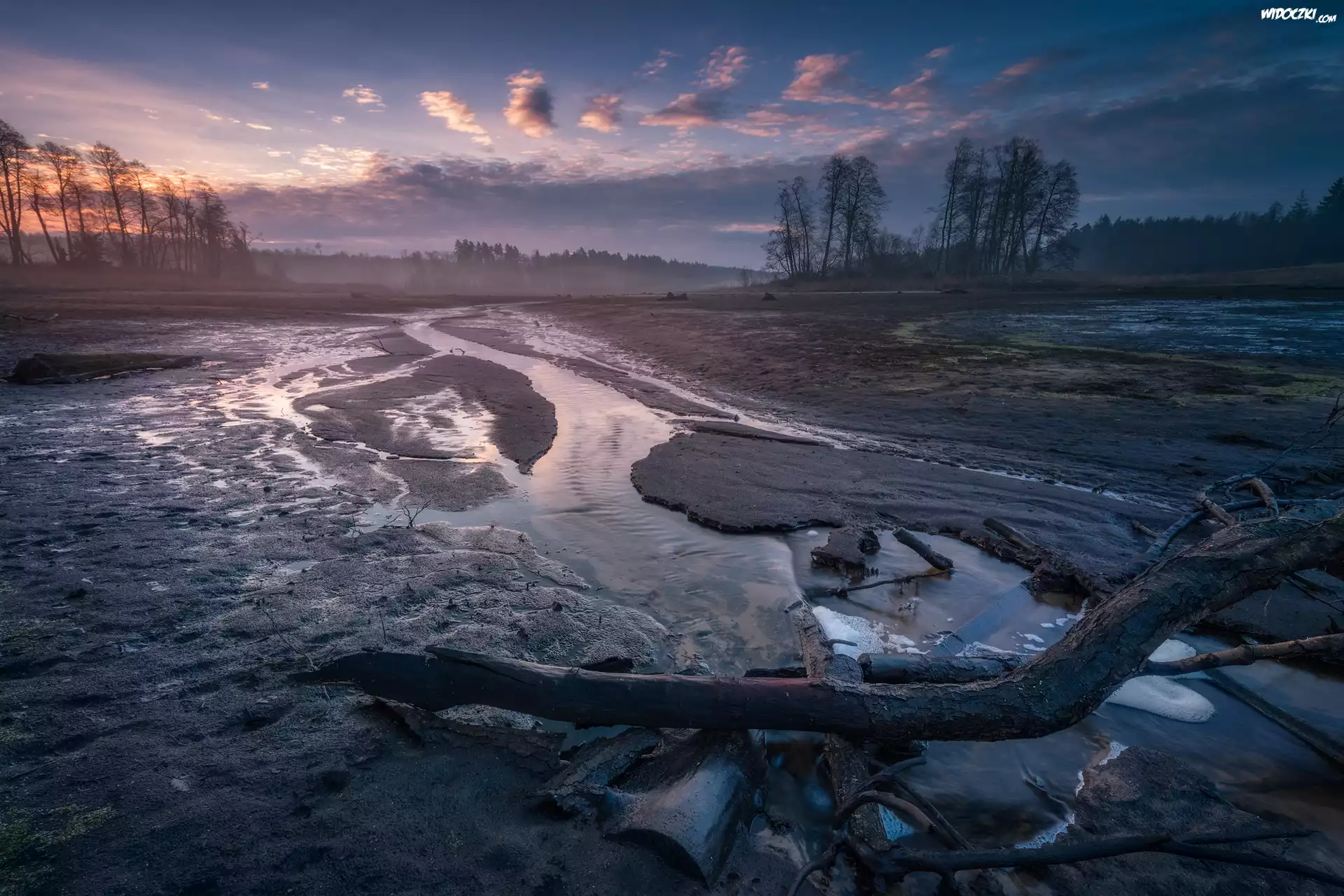Drzewa, Chmury, Niebo, Mgła, Rzeka, Rozlewisko