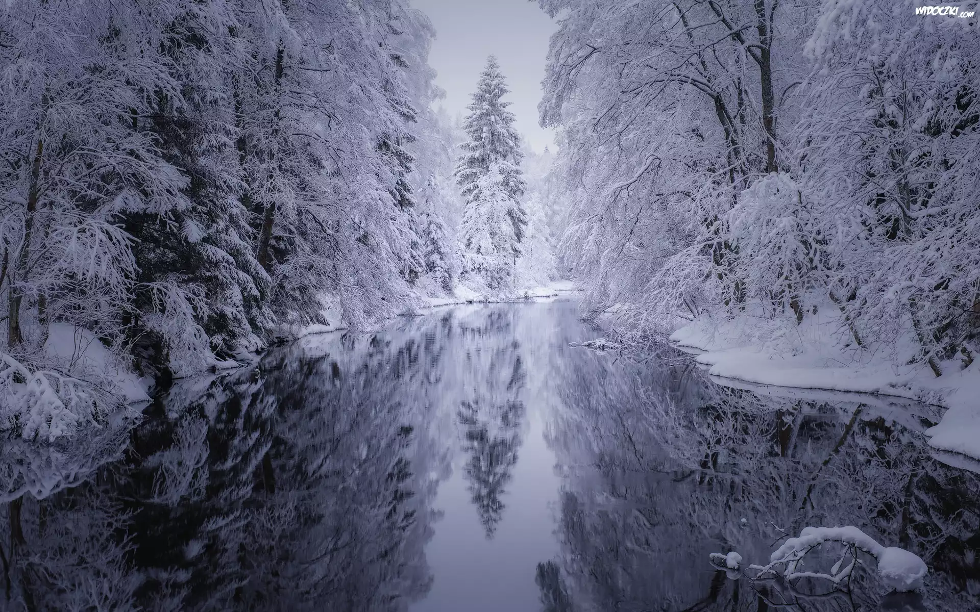 Zdjęcia, Drzewa, Śnieg, Rzeka, Las