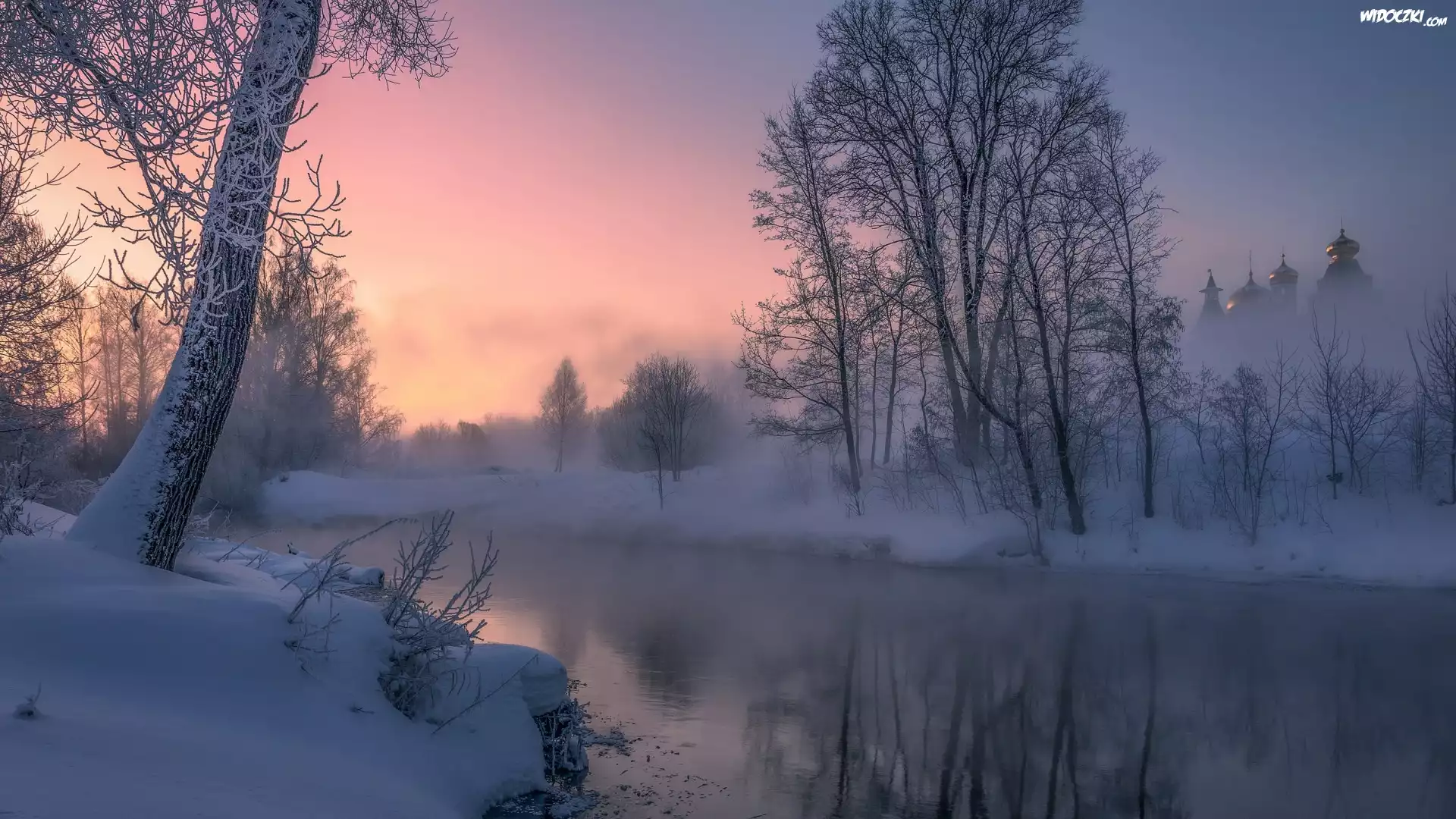 Zima, Poranek, Rzeka, Mgła, Drzewa, Cerkiew, Wieże, Drzewa