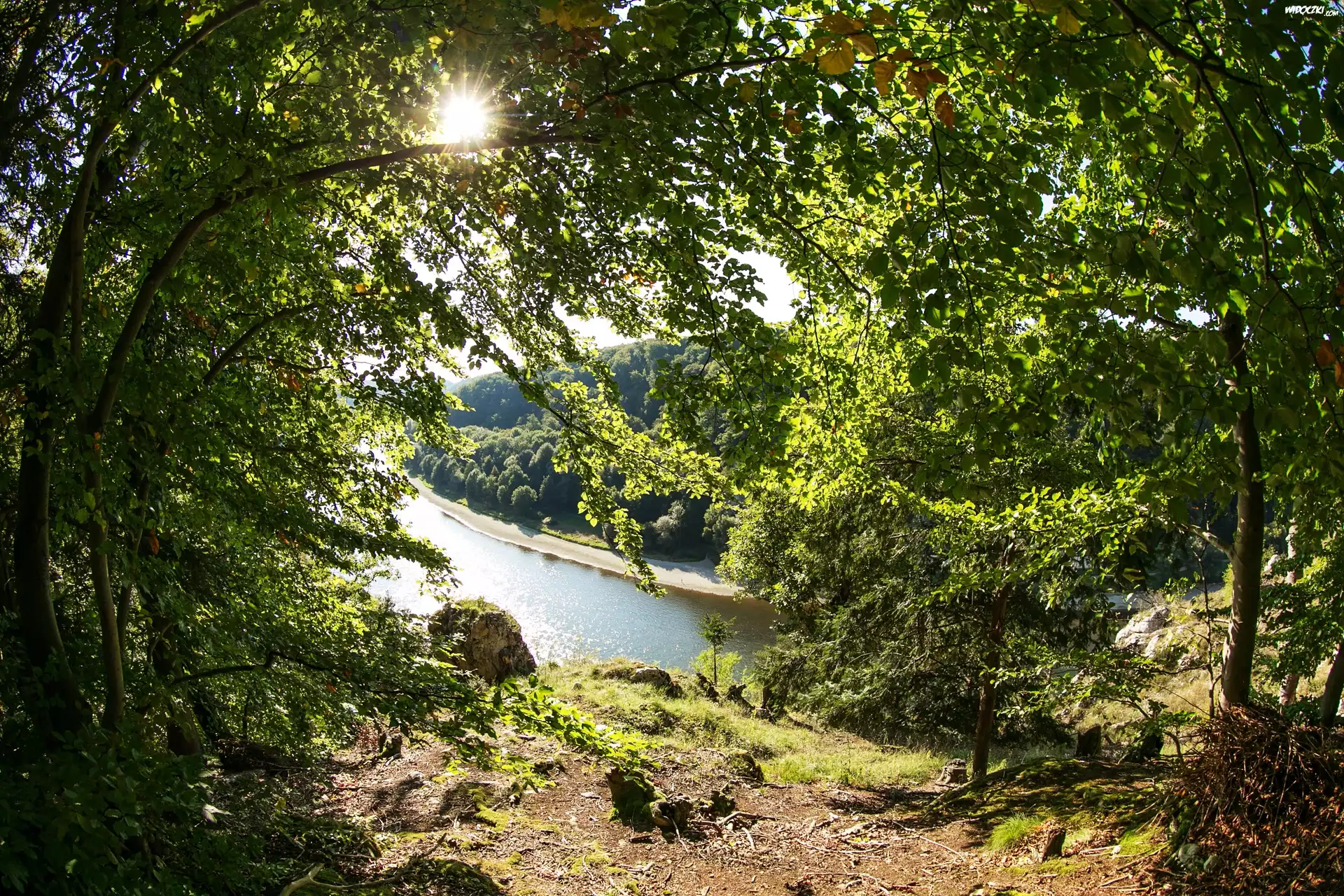 Rzeka, Drzewa, Wschód słońca, Z lotu ptaka