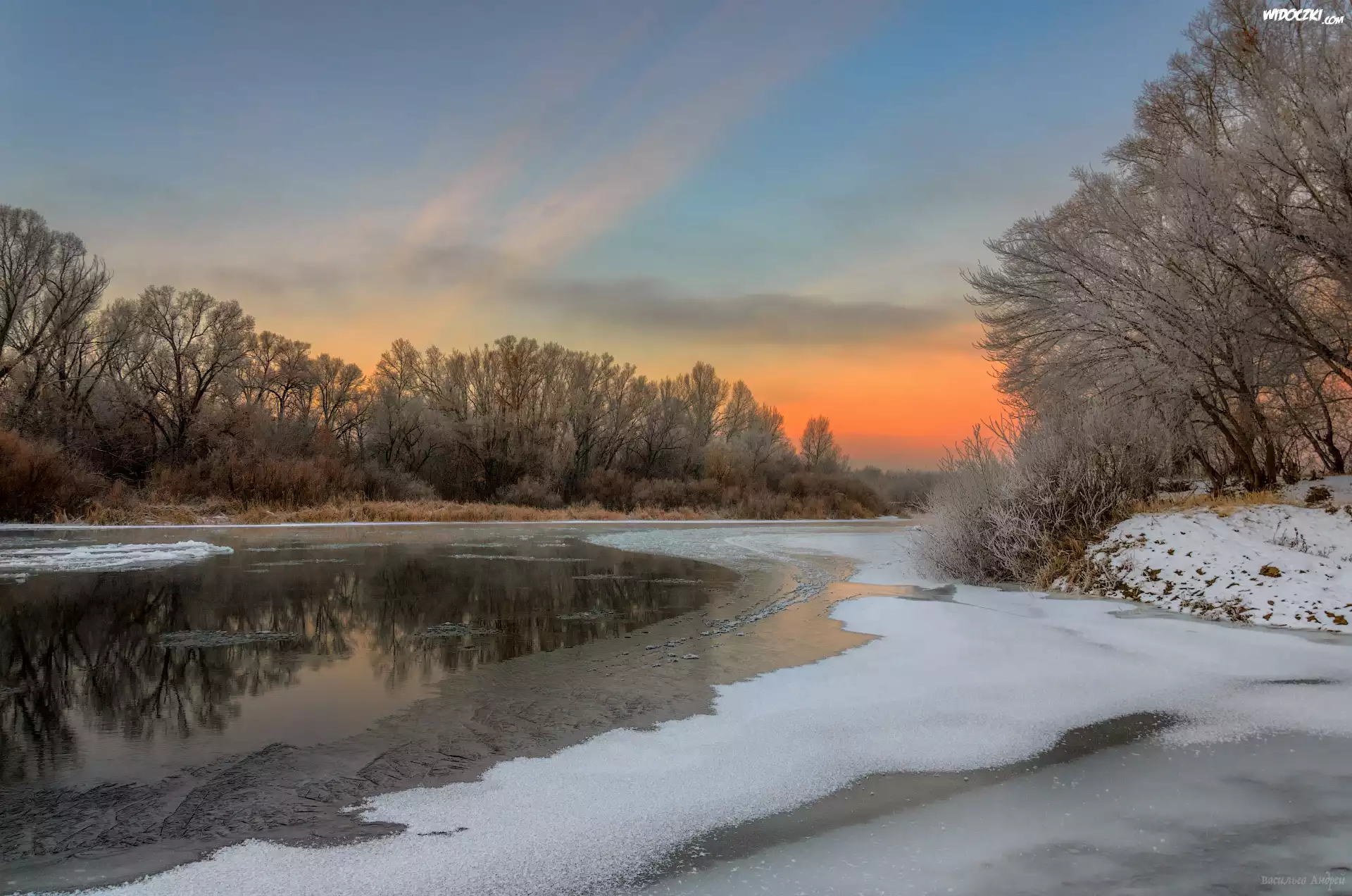 Zima, Śnieg, Rzeka, Drzewa, Wschód słońca, Poranek