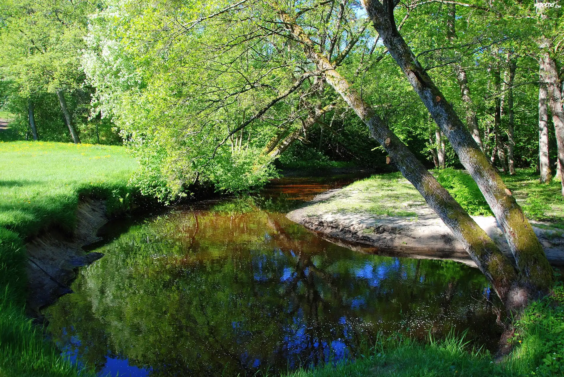 Zdjęcia, Rzeka, Drzewa, Trawa