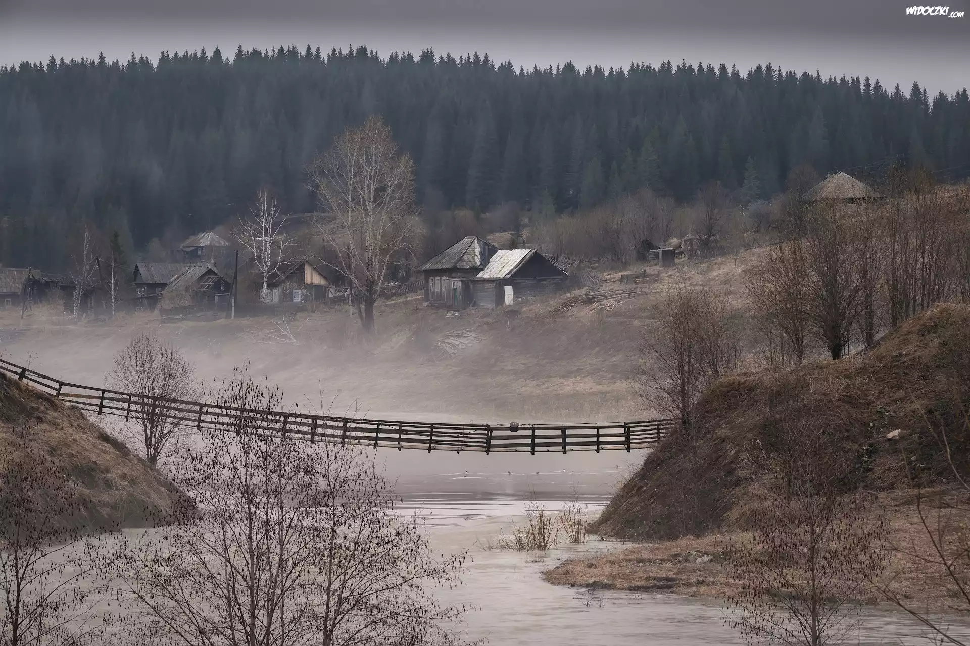 Rzeka, Drzewa, Łąka, Domy, Mgła, Most, Wieś
