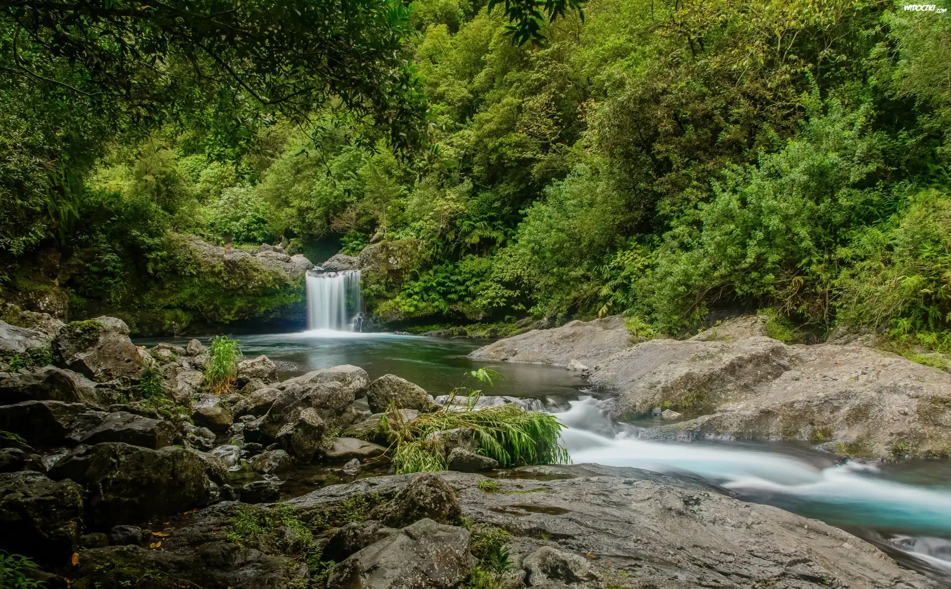 Drzewa, Las, Wodospad, Rzeka, Kamienie