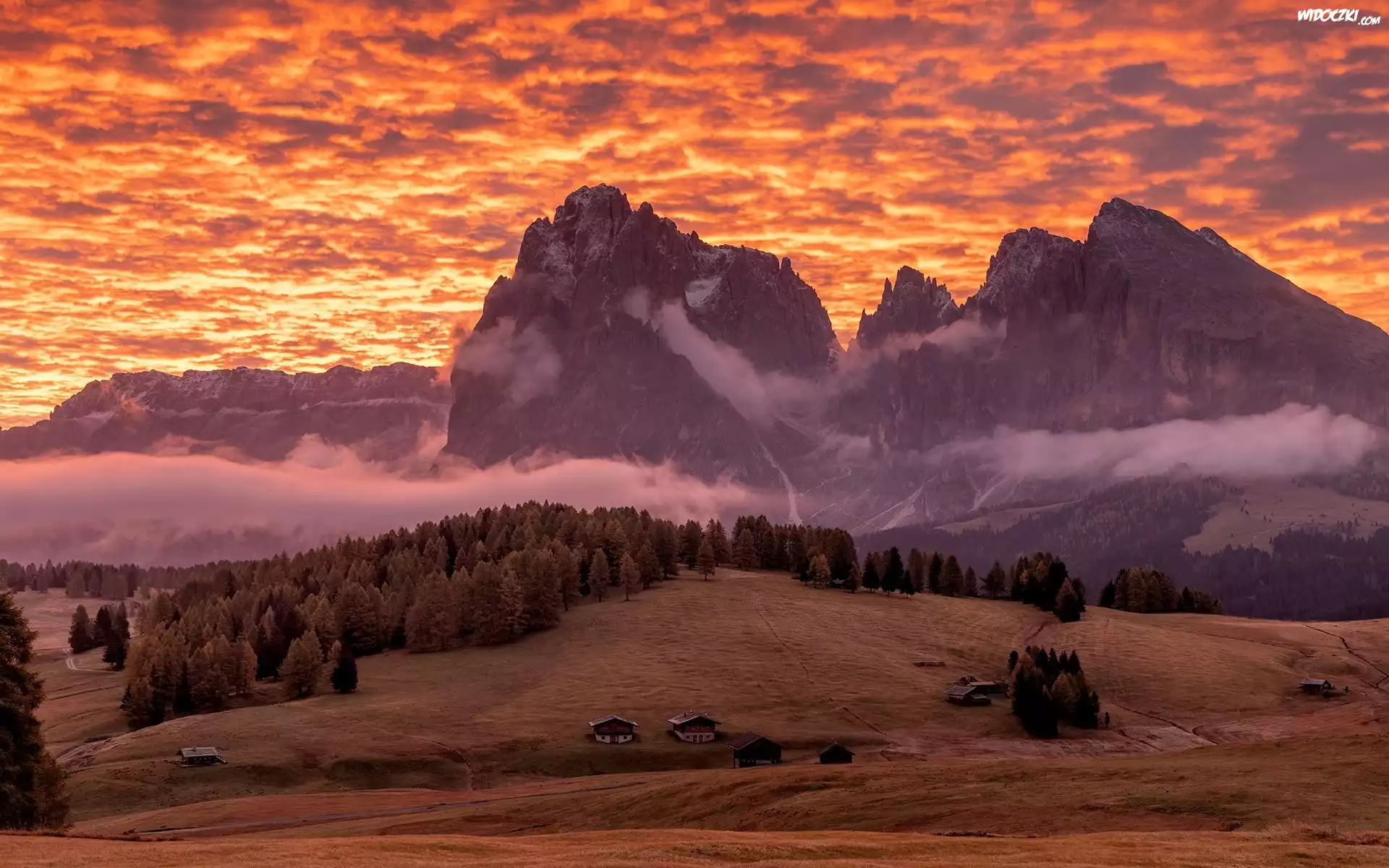 Dolomity, Góry, Sassolungo, Drewniane, Domki, Drzewa, Jesień, Mgła, Zachód słońca, Chmury, Płaskowyż, Seiser Alm, Dolina, Val Gardena, Włochy |