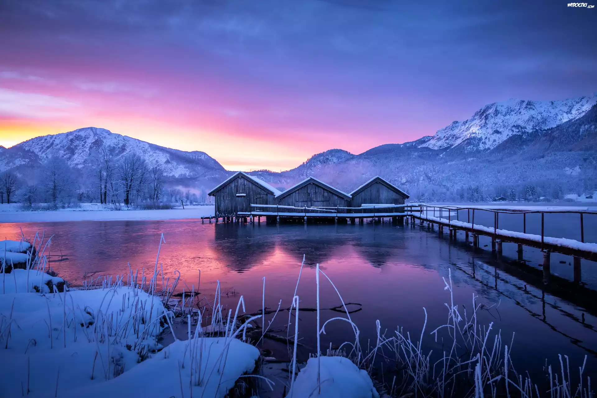 Schlehdorf, Jezioro Kochelsee, Zima, Góry, Drzewa, Pomost, Domki, Wschód słońca, Bawaria, Niemcy |