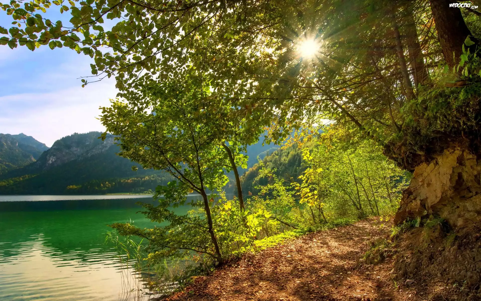 Zdjęcia, Góry, Jezioro, Ścieżka, Drzewa, Niebo, Promienie słońca