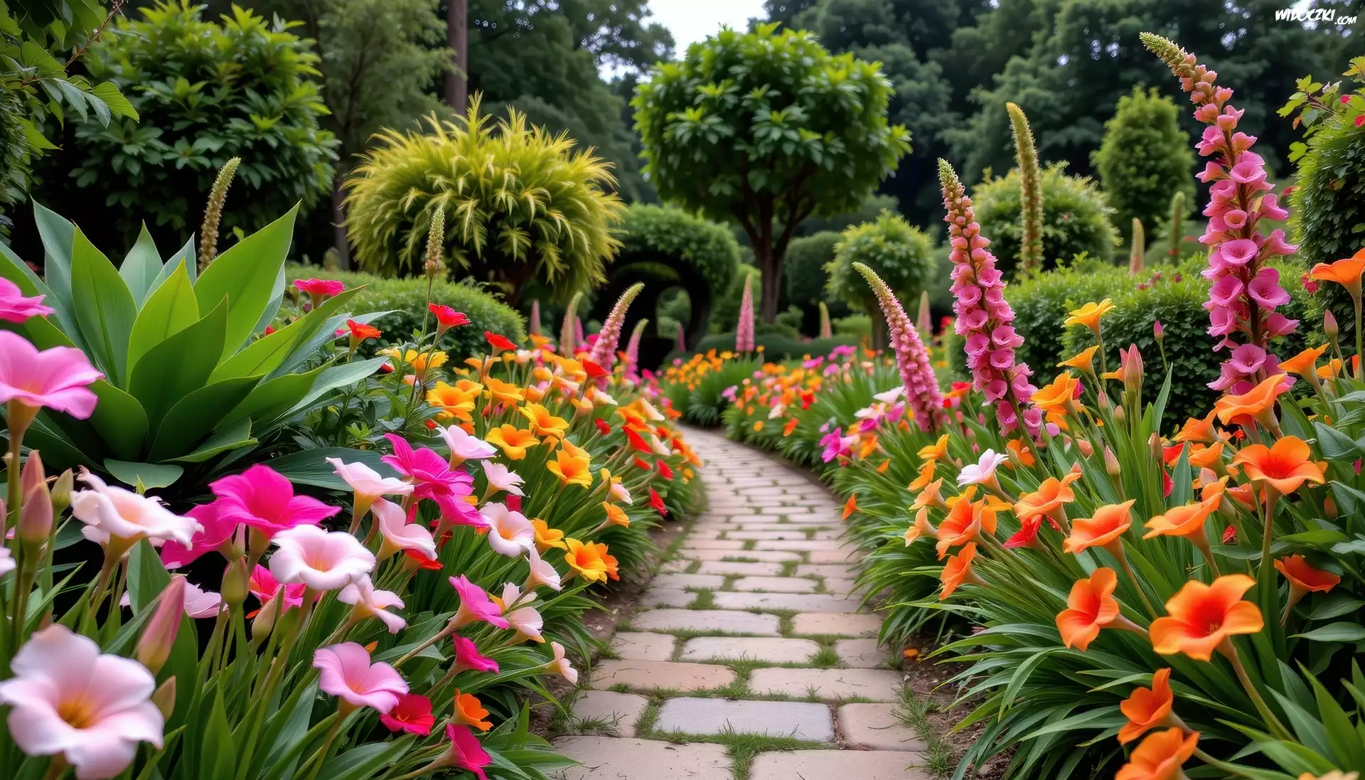 Zdjęcia, Ogród, Kwiaty, Ścieżka, Drzewa, Lato, Grafika AI