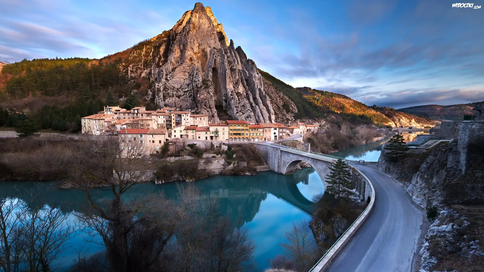 Zdjęcia, Francja, Prowansja, Sisteron, Skała Sisteron, Rzeka Durance, Most, Domy, Drzewa