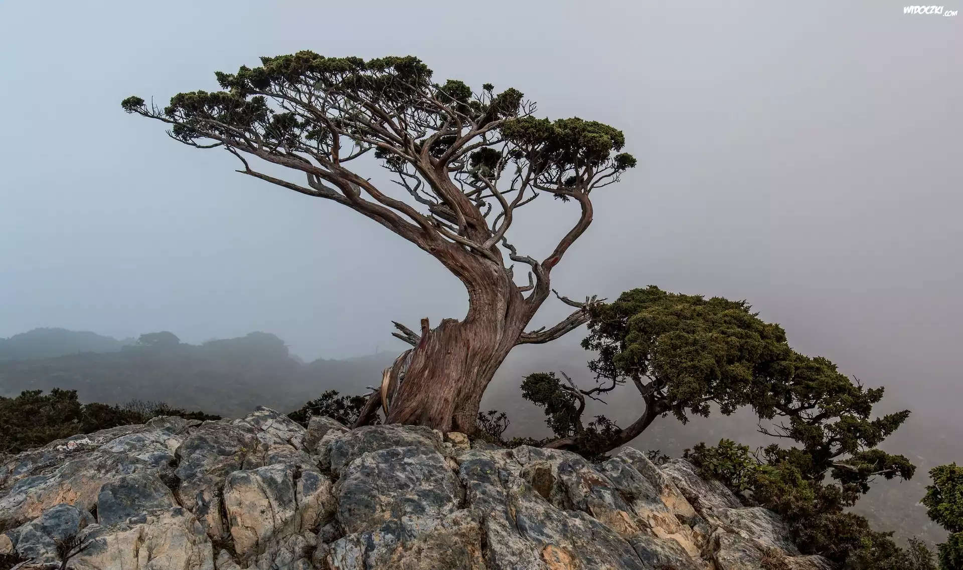 Zdjęcia, Drzewa, Sosny, Skały, Mgła