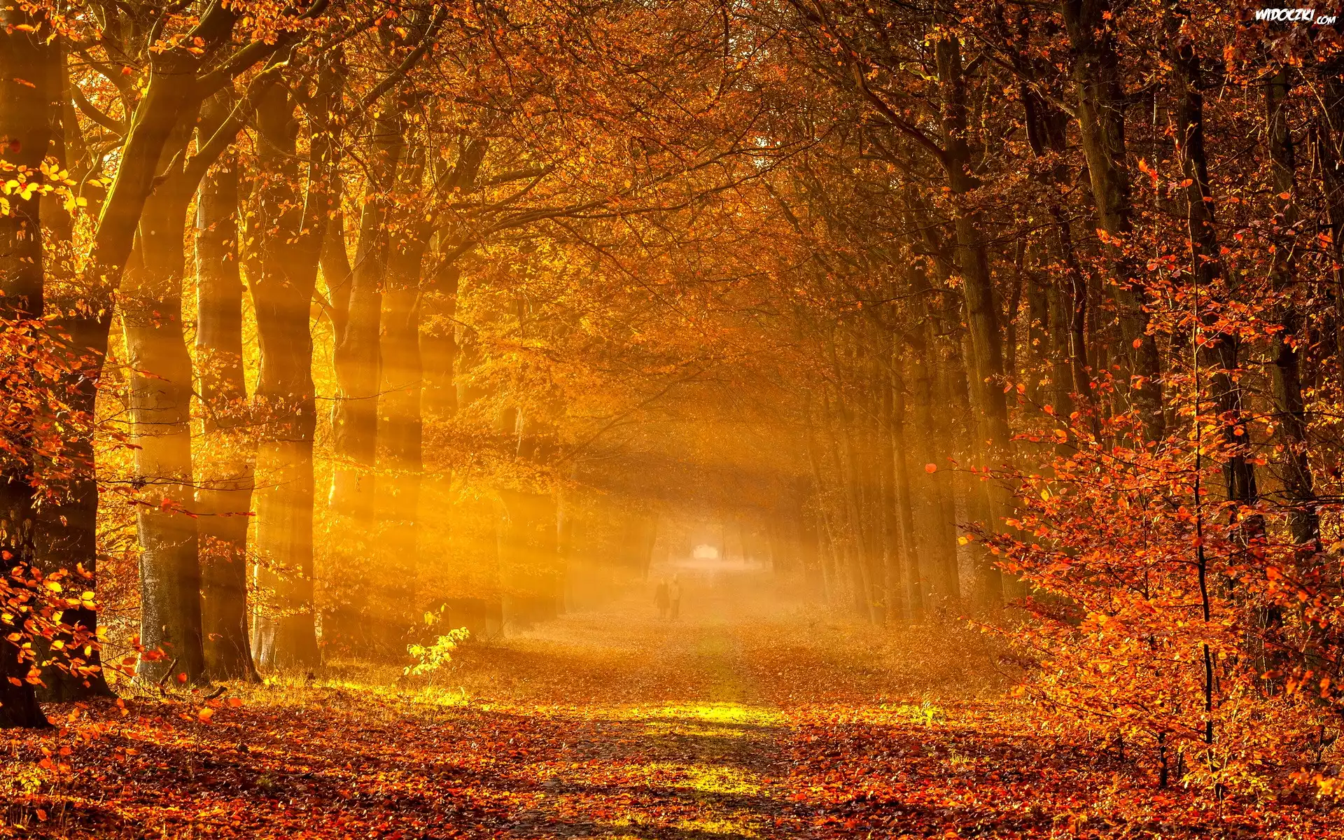 Drzewa, Las, Droga, Promienie Słońca, Jesień