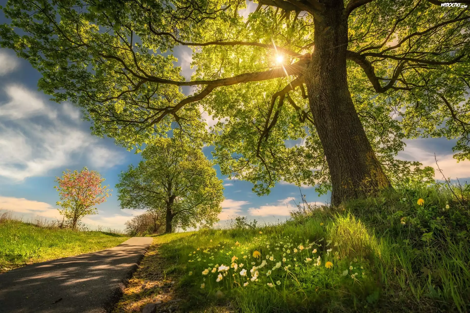Drzewa, Droga, Kwiaty, Promienie słońca, Wiosna