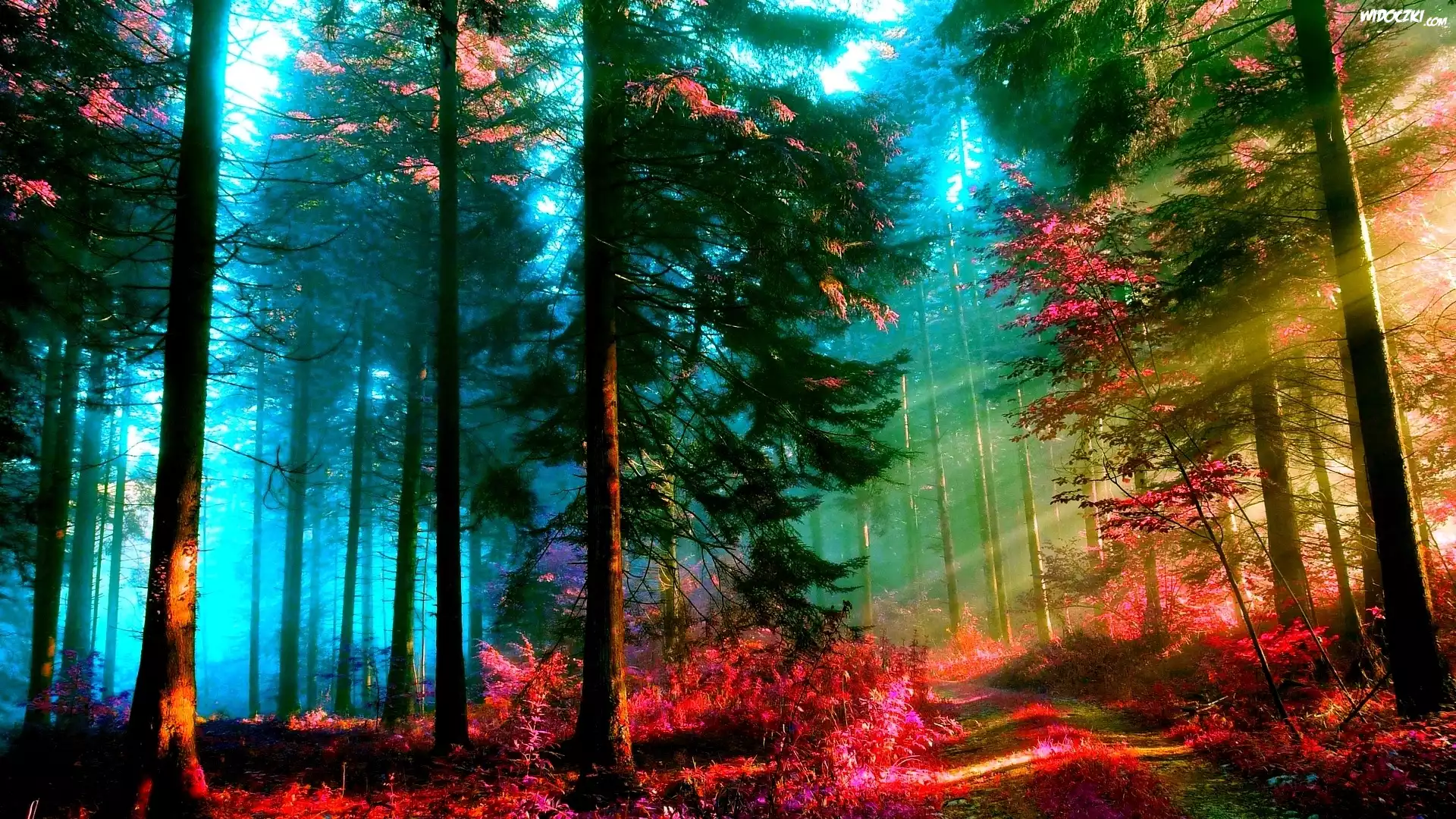 Zdjęcia, Drzewa, Kolorowe, Liście, Promienie, Słońca, Las