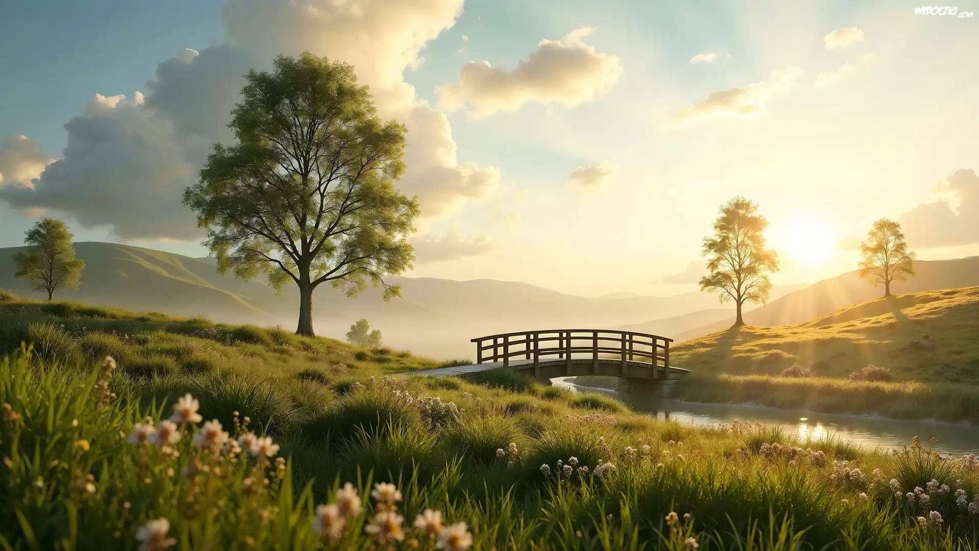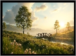 Łąka, Rzeka, Mostek, Drzewa, Zachód słońca