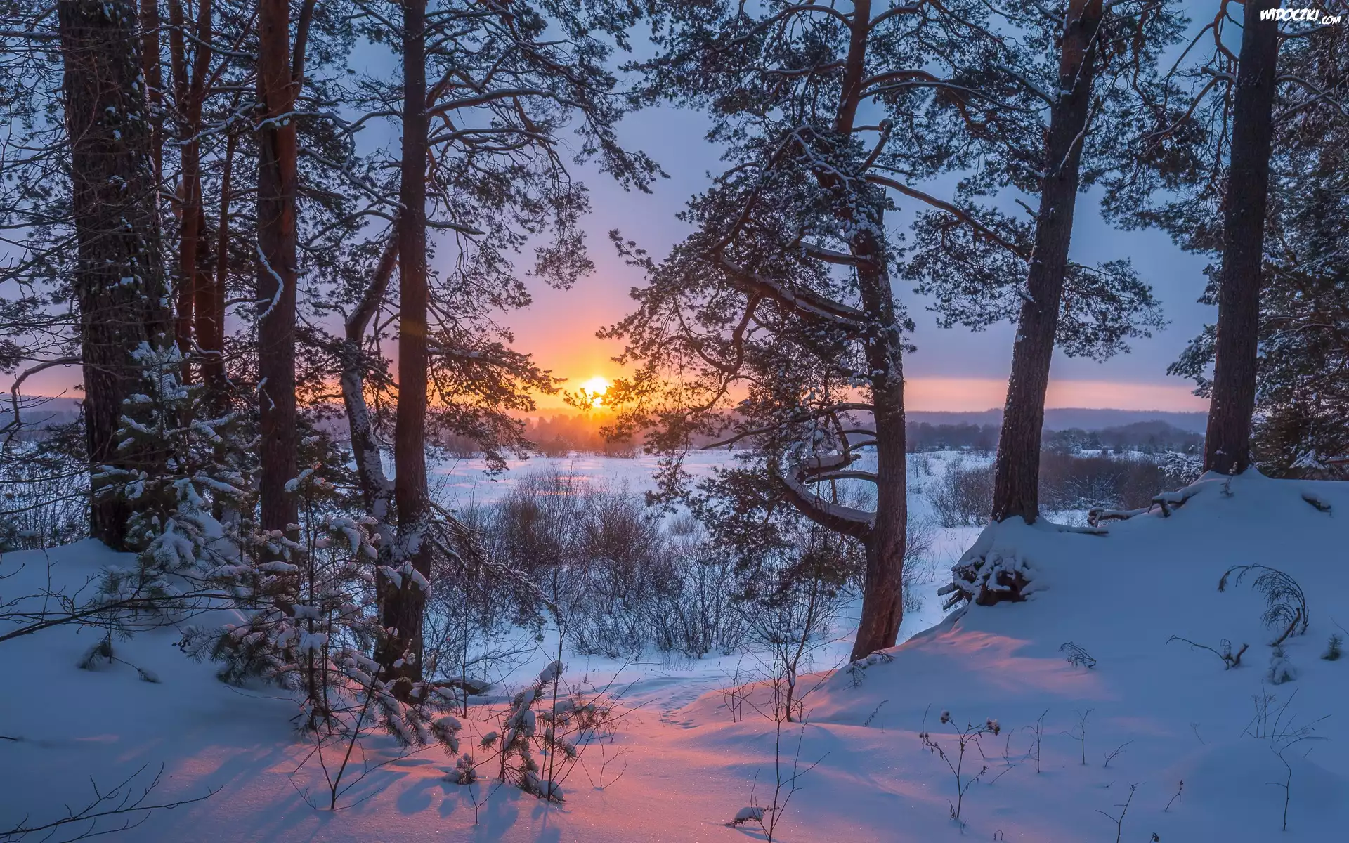 Zima, Śnieg, Słońce, Drzewa, Zachód słońca