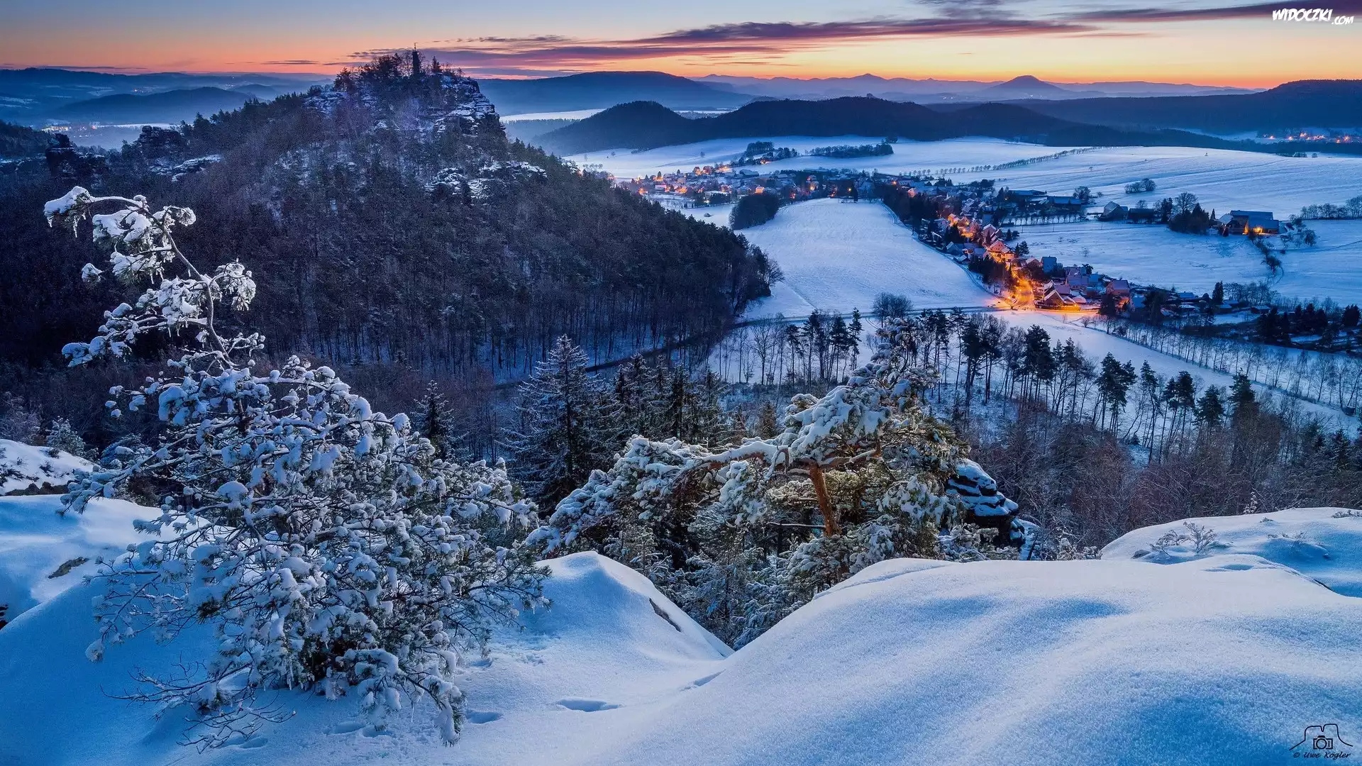 Zdjęcia, Zima, Zachód słońca, Góry, Osada, Domy, Ośnieżone, Drzewa