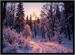 Zima, Zachód słońca, Las, Zaśnieżona, Droga, Ośnieżone, Drzewa