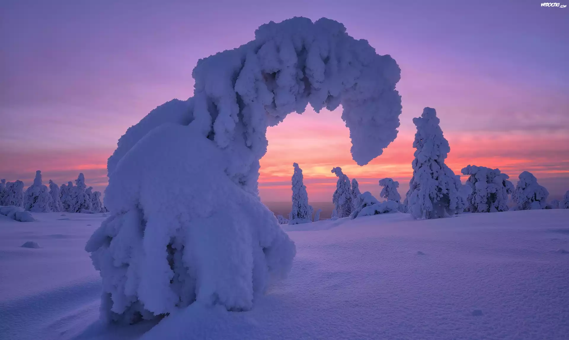 Zdjęcia, Zima, Zaśnieżone, Drzewa, Wschód słońca, Park Narodowy Riisitunturi, Gmina Posio, Finlandia