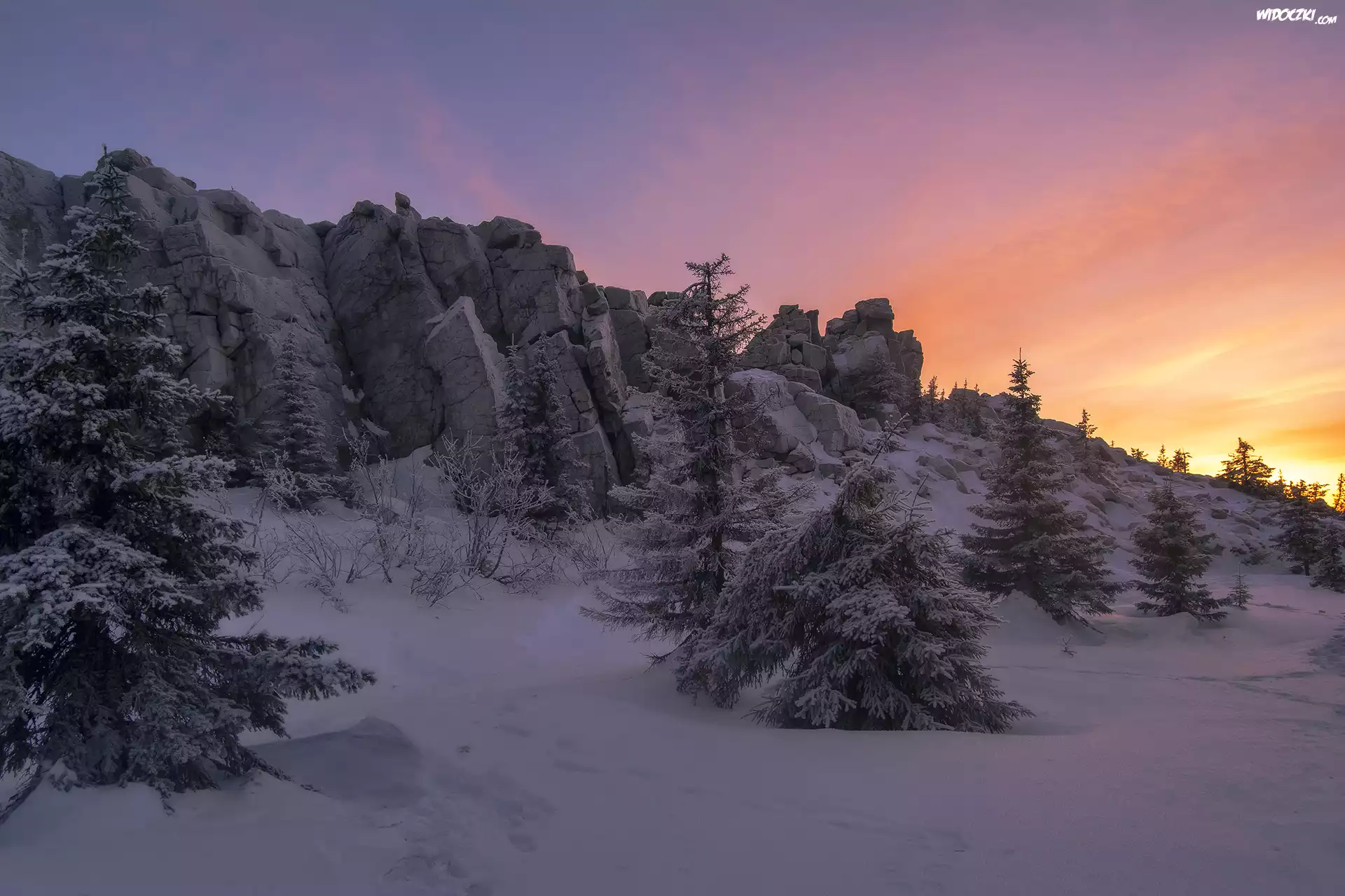 Zima, Skały, Drzewa, Zachód słońca, Park Narodowy Ziuratkul, Obwód czelabiński, Rosja