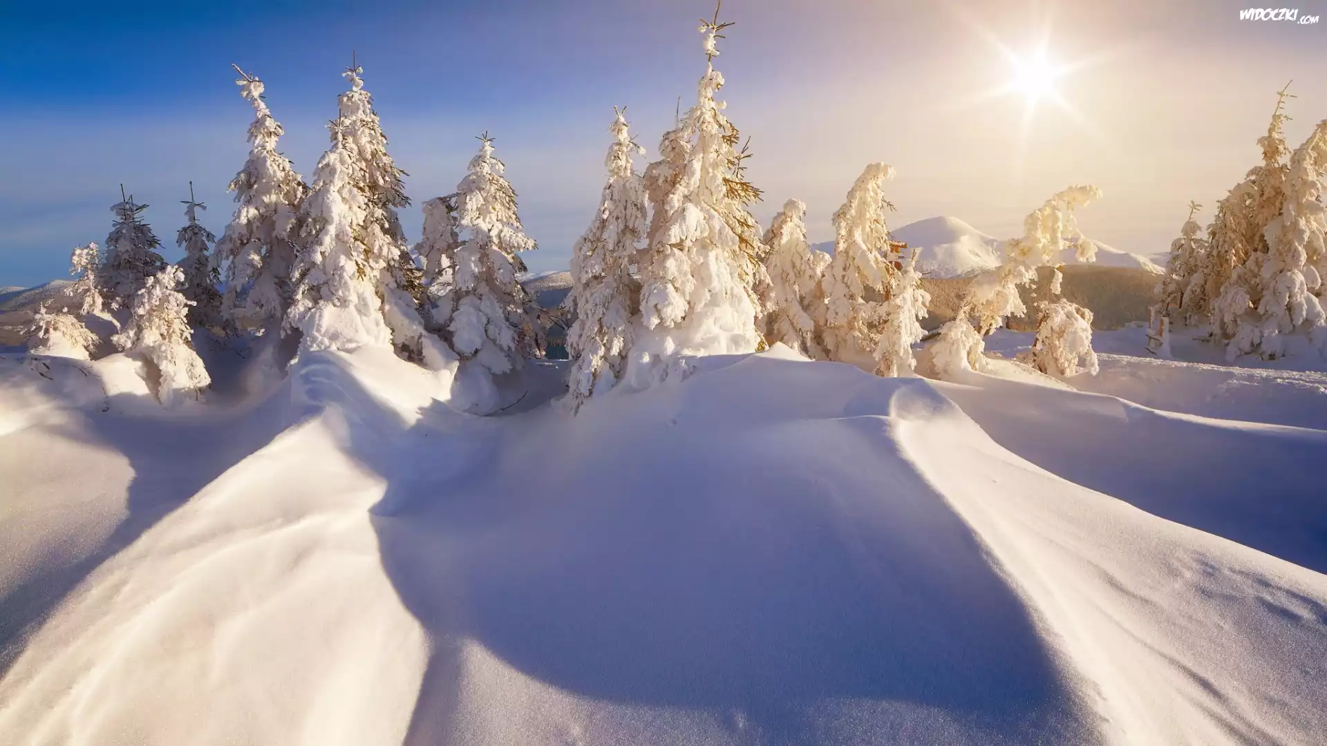 Zima, Śnieg, Zaspy, Drzewa, Promienie słońce