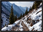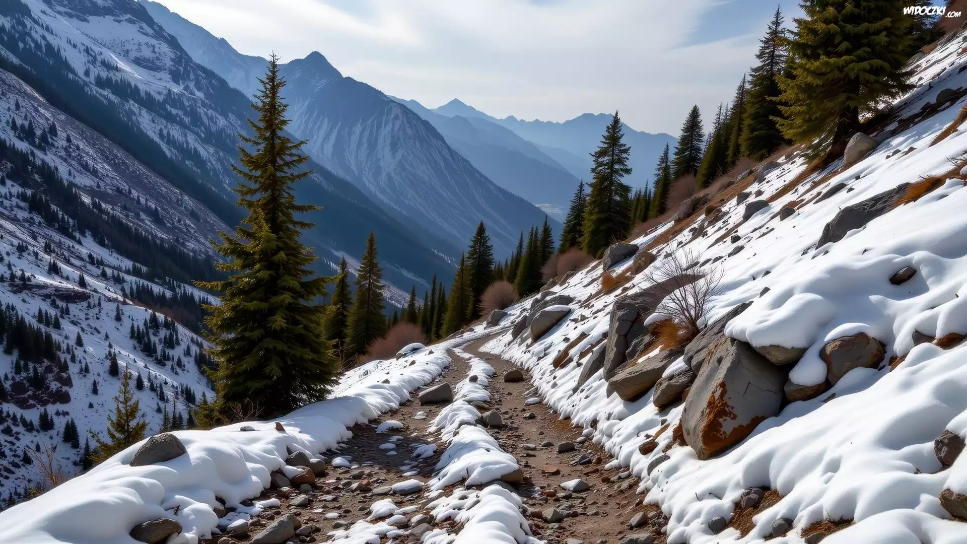 Zdjęcia, Zima, Góry, Śnieg, Drzewa, Świerki, Droga, Kamienie