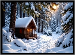 Drewniany, Dom, Las, Drzewa, Zima, Åšnieg