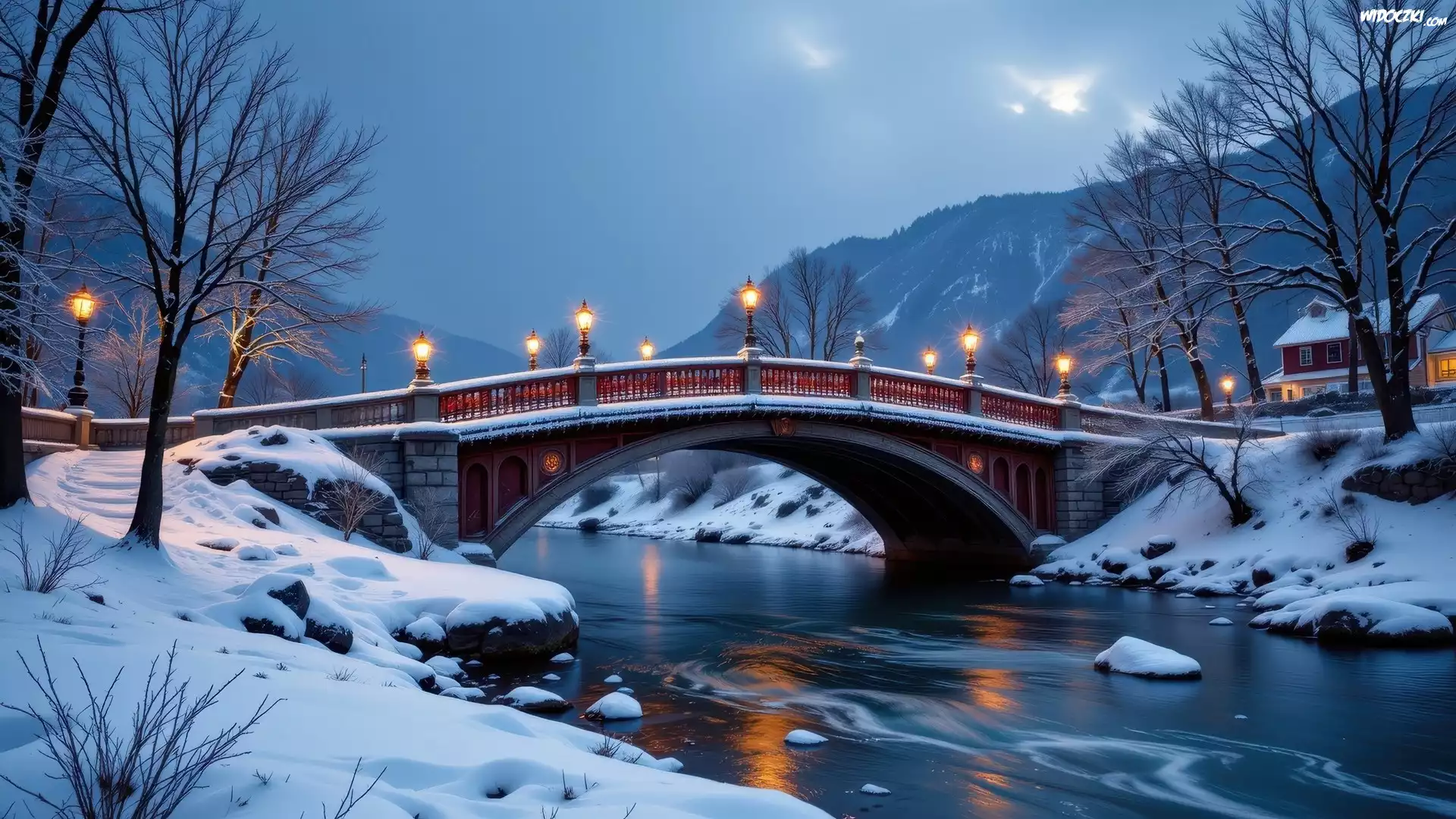 Zdjęcia, Zima, Zmrok, Śnieg, Rzeka, Most, Latarnie, Dom, Drzewa