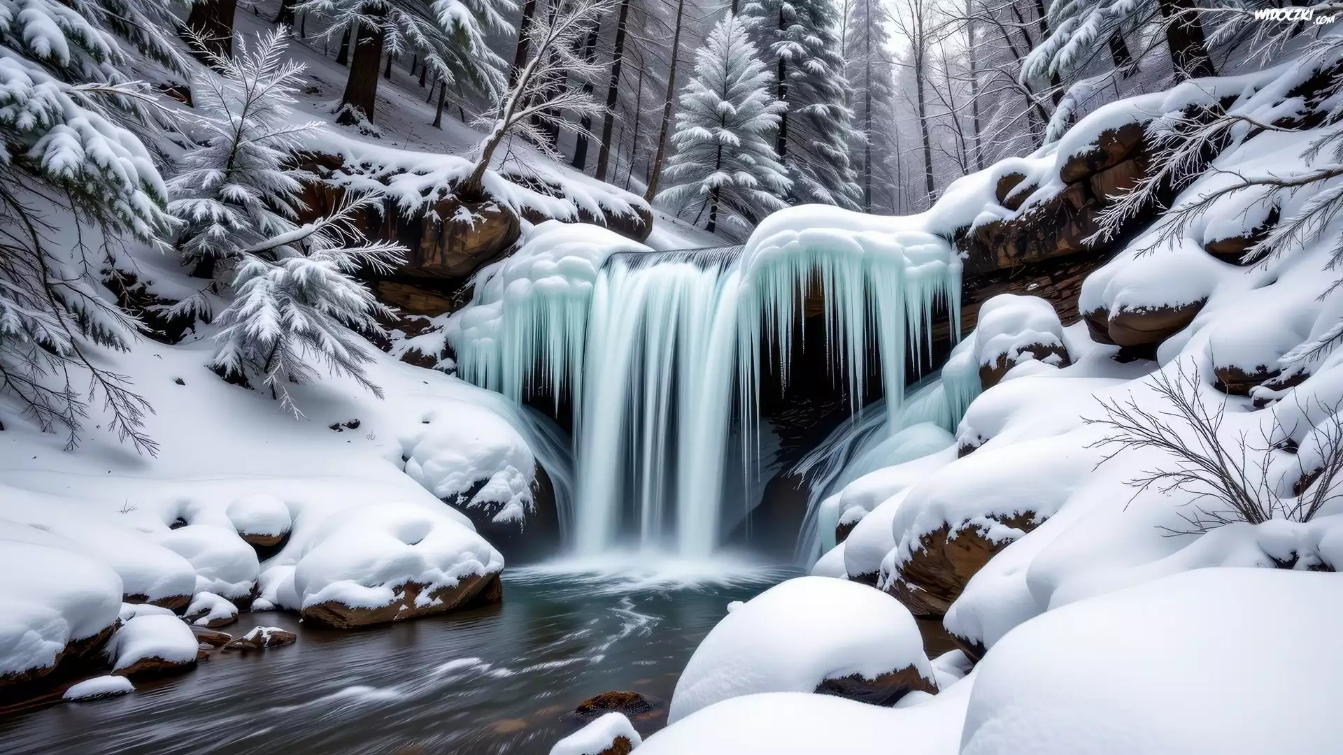 Zdjęcia, Skały, Uskok, Sople, Lodu, Śnieg, Zima, Ośnieżone, Drzewa