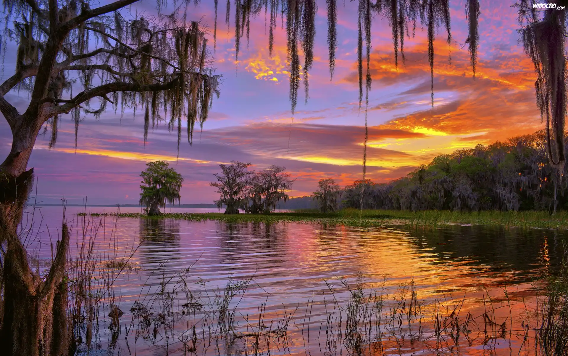 Zdjęcia, Stany Zjednoczone, Stan Floryda, Zachód słońca, Jezioro Istokpoga, Drzewa